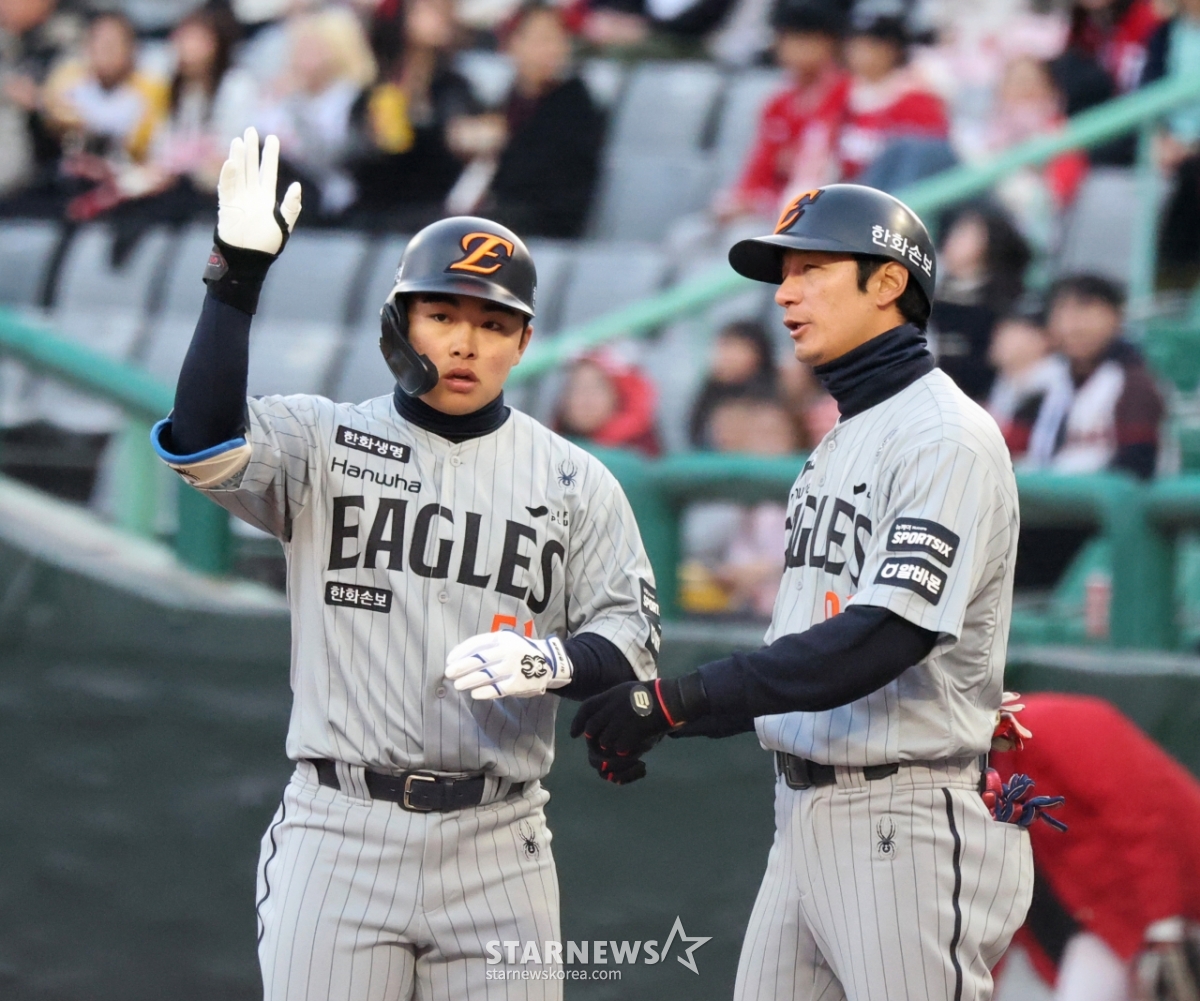 한화 3번타자 문현빈이 7일 랜더스필드에서 열린 2026KBO리그 한화이글스와 SSG랜더스 시즌 첫 경기 1회초 1사 2루에서 적시타로 출루하고 있다. 2026.04.07.