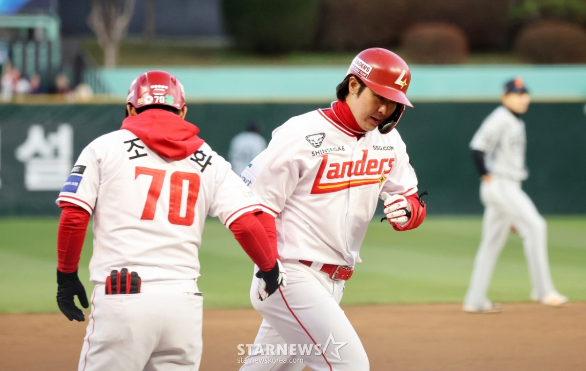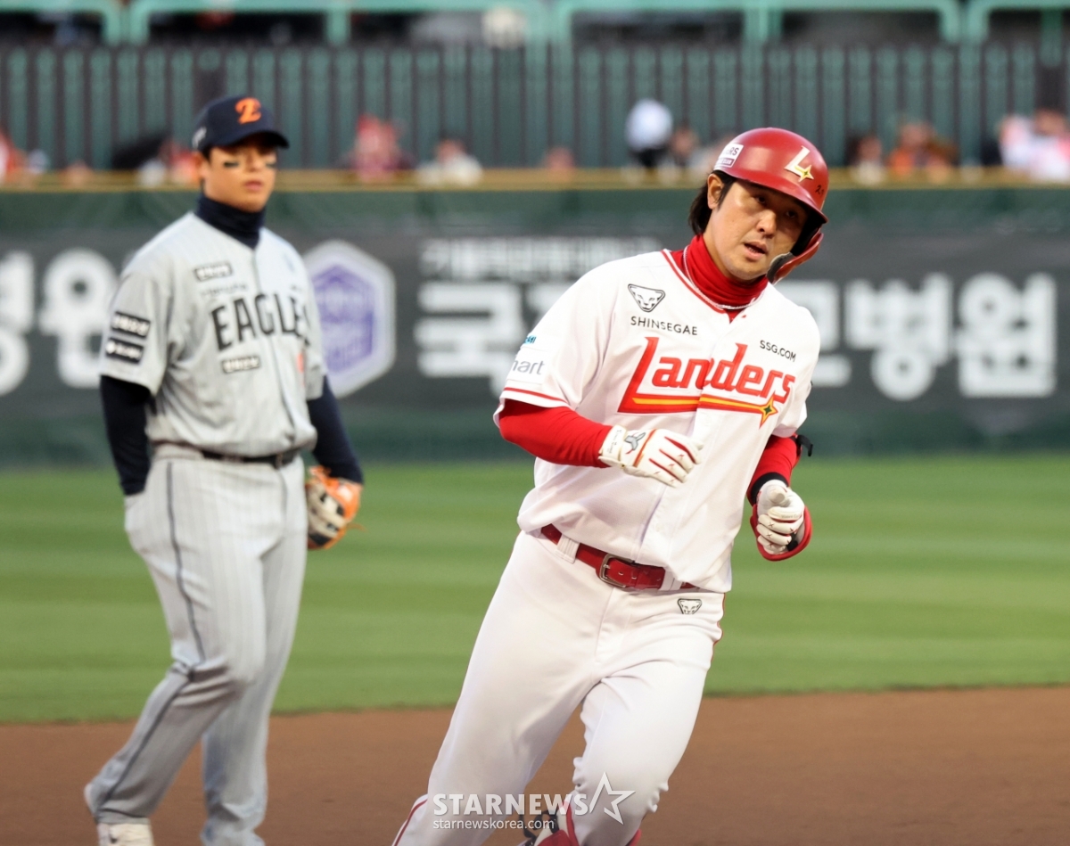 랜더스 3번타자 최정이 7일 랜더스필드에서 열린 2026KBO리그 한화이글스와 SSG랜더스 시즌 첫 경기 1회말 역전투런홈런을 터트린 후 홈인하고 있다. 노시환이 최정을 쳐다보고 있다. 2026.04.07.
