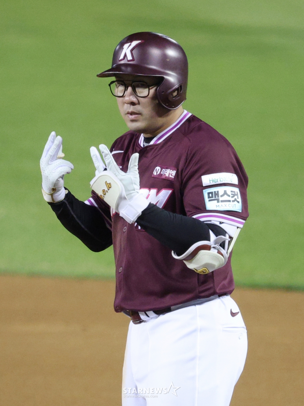 키움 안치홍이 7회초 무사 1,2루에서 우전 안타를 날리고 출루한 후 세리머니를 하고 있다.