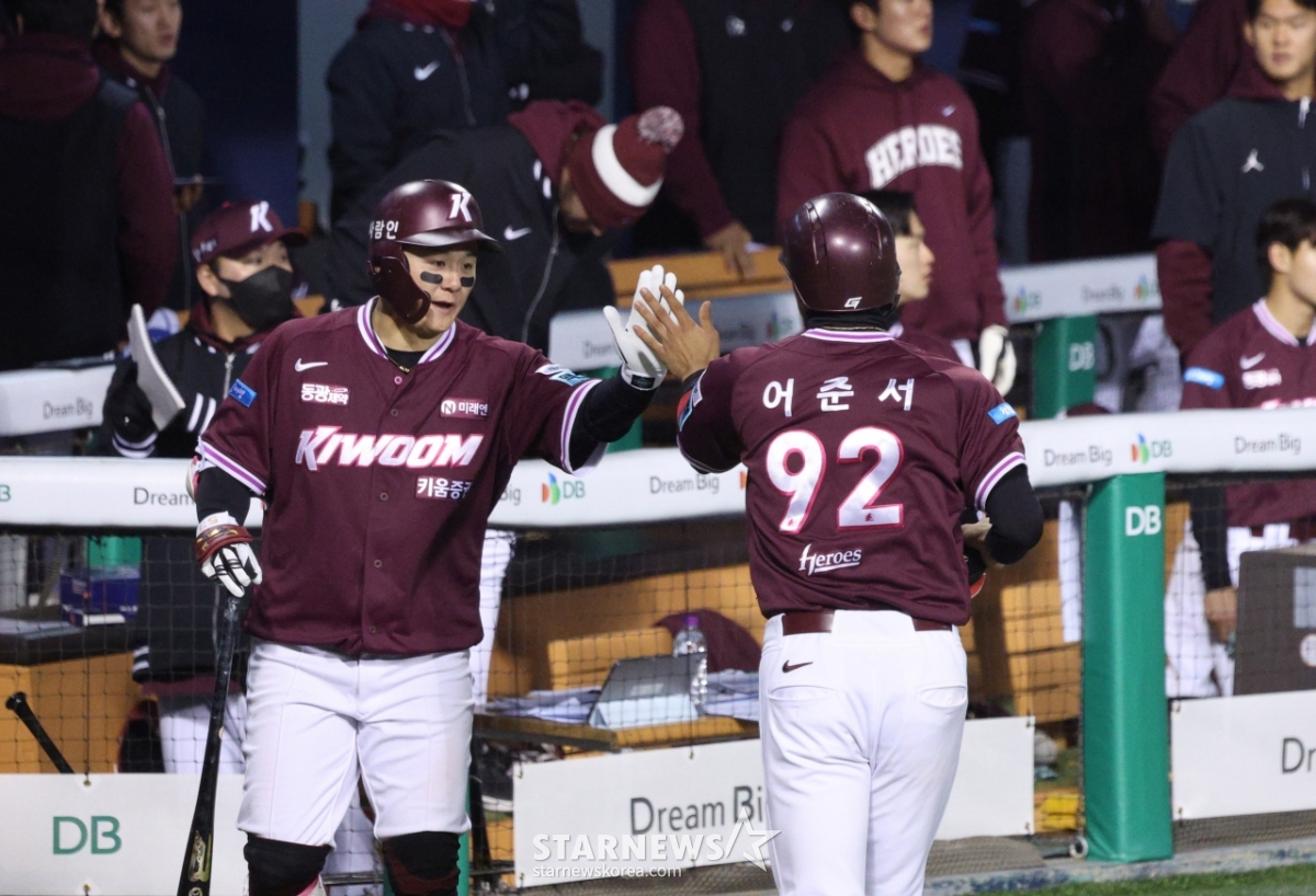 키움 7회초 무사 만루에서 3루주자 어준서가 이주형의 내야땅볼 때 득점한 후 동료들의 환영을 받고 있다.