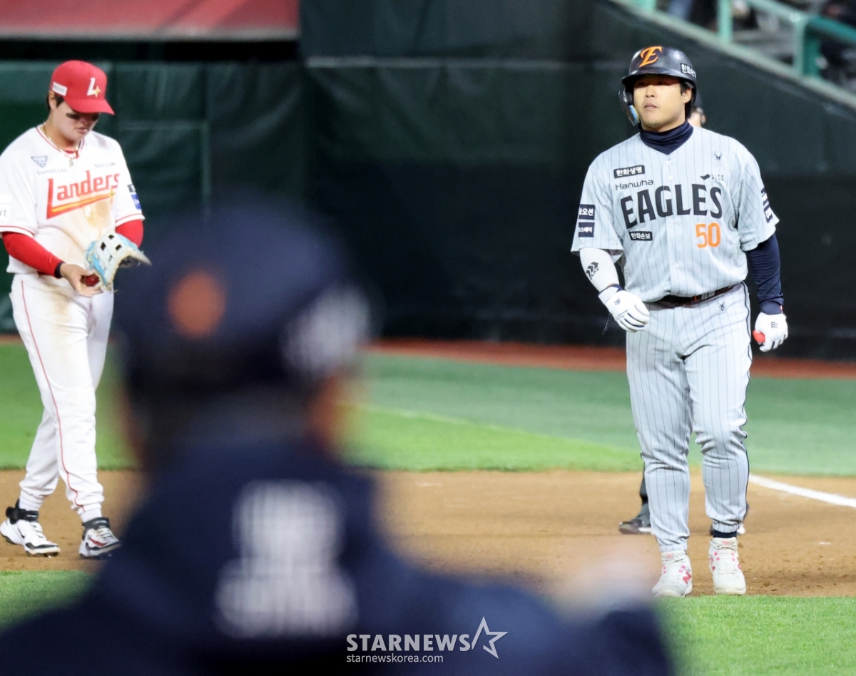 한화 3번타자 강백호가 7일 랜더스필드에서 열린 2026KBO리그 한화이글스와 SSG랜더스 시즌 첫 경기 9회초 1사 1,2루에서 1타점 적시타로 출루한 후 교체되며 더그아웃으로 향하고 있다. 2026.04.07.