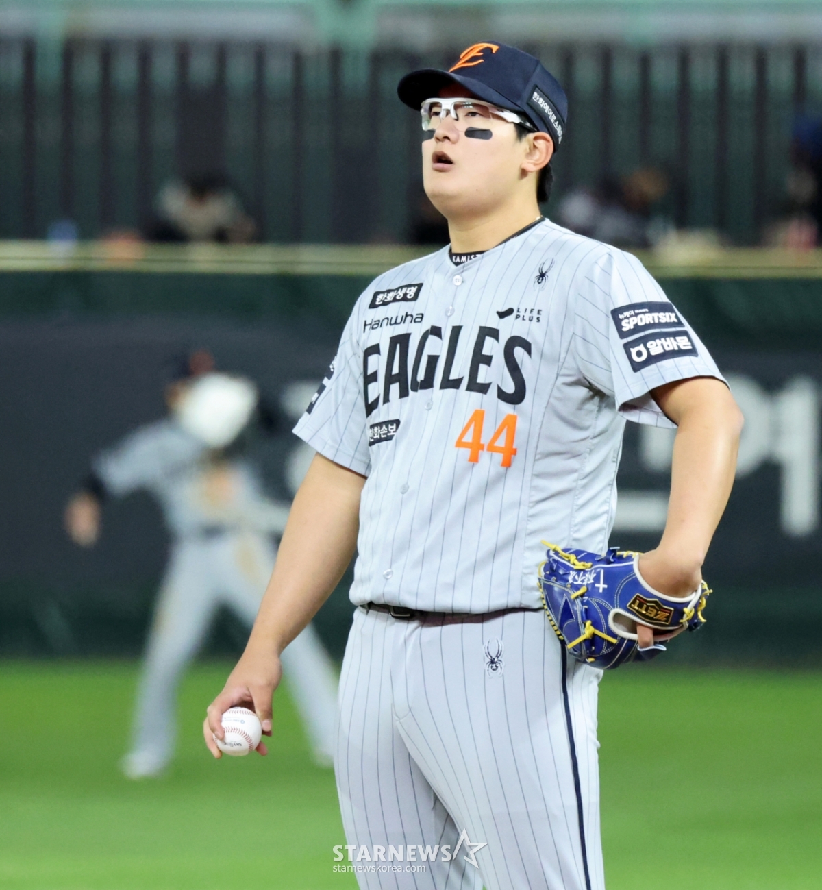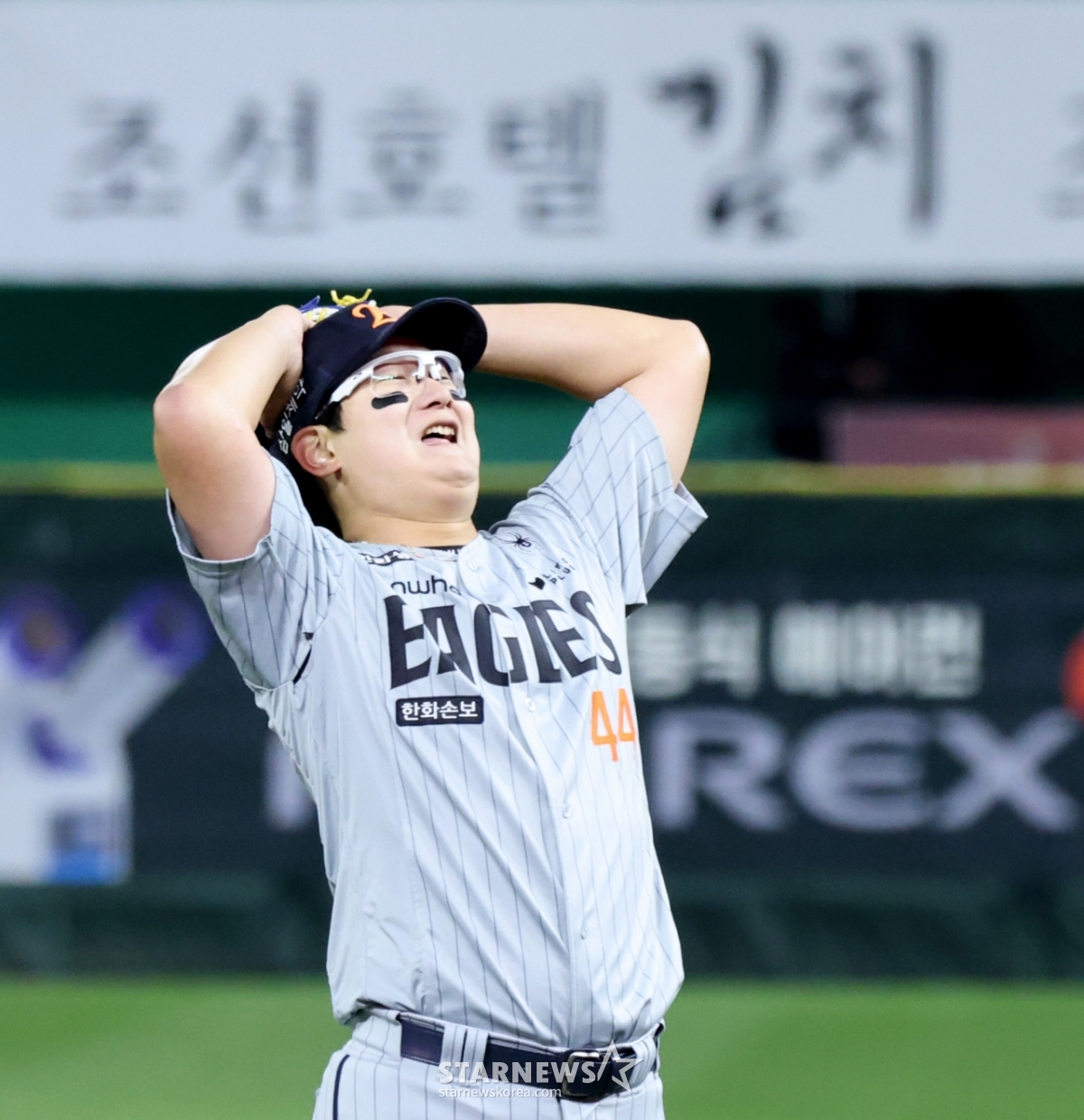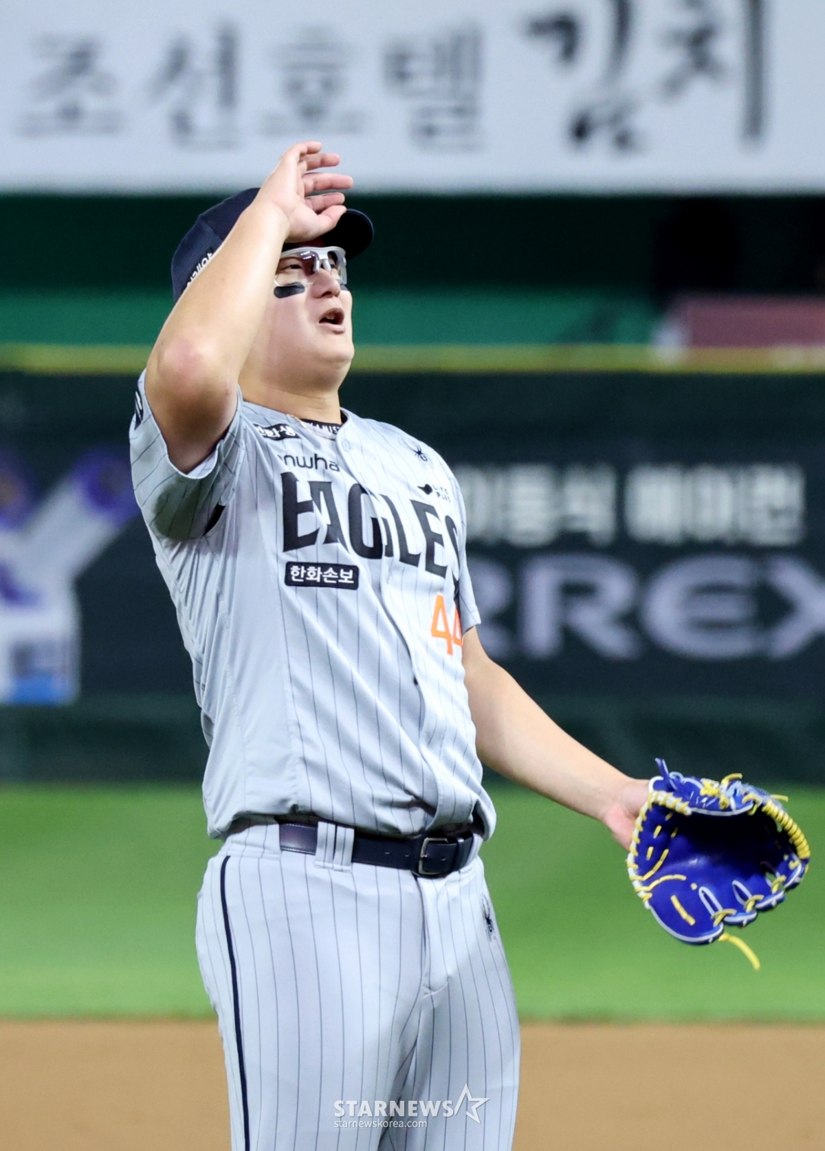 한화 마무리 김서현이 7일 랜더스필드에서 열린 2026KBO리그 한화이글스와 SSG랜더스 시즌 첫 경기 9회말 첫타자 김재환을 스트레이트 볼넷으로 내보냈지만 이후 세타자르 처리한 후 안도의 한숨을 쉬고 있다. 2026.04.07.