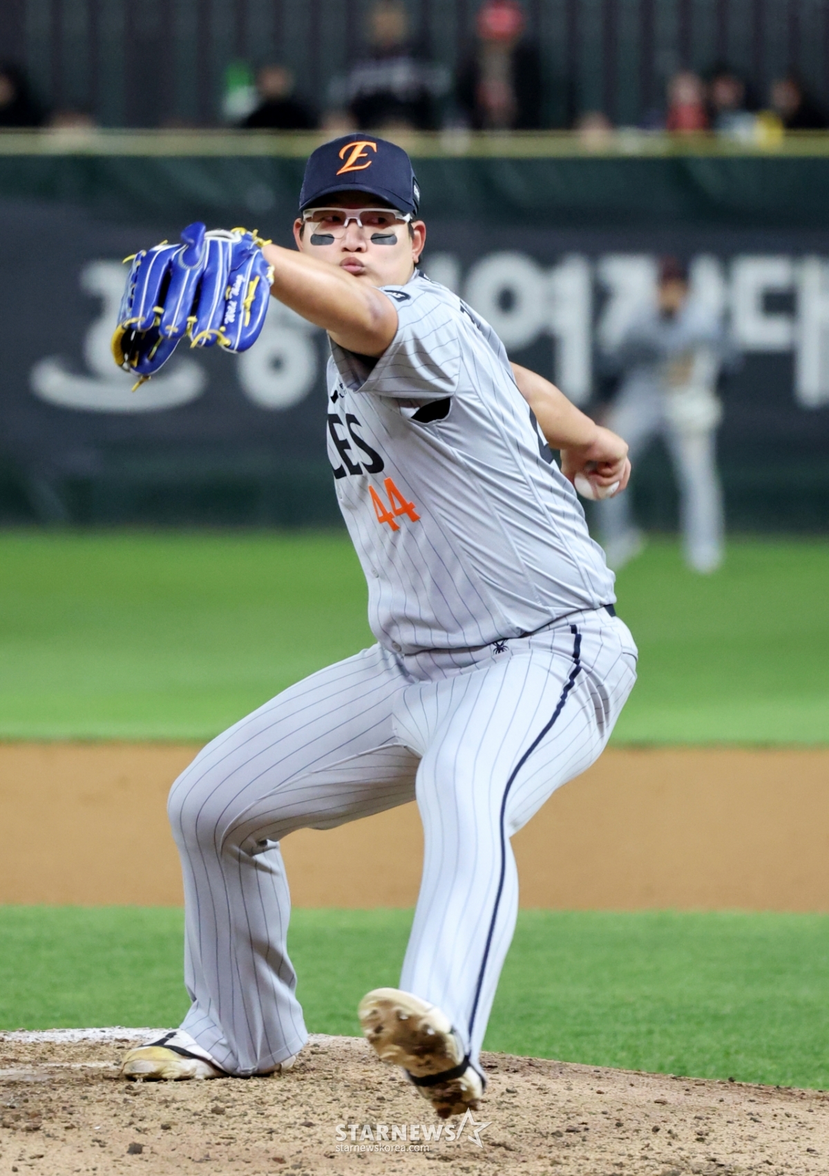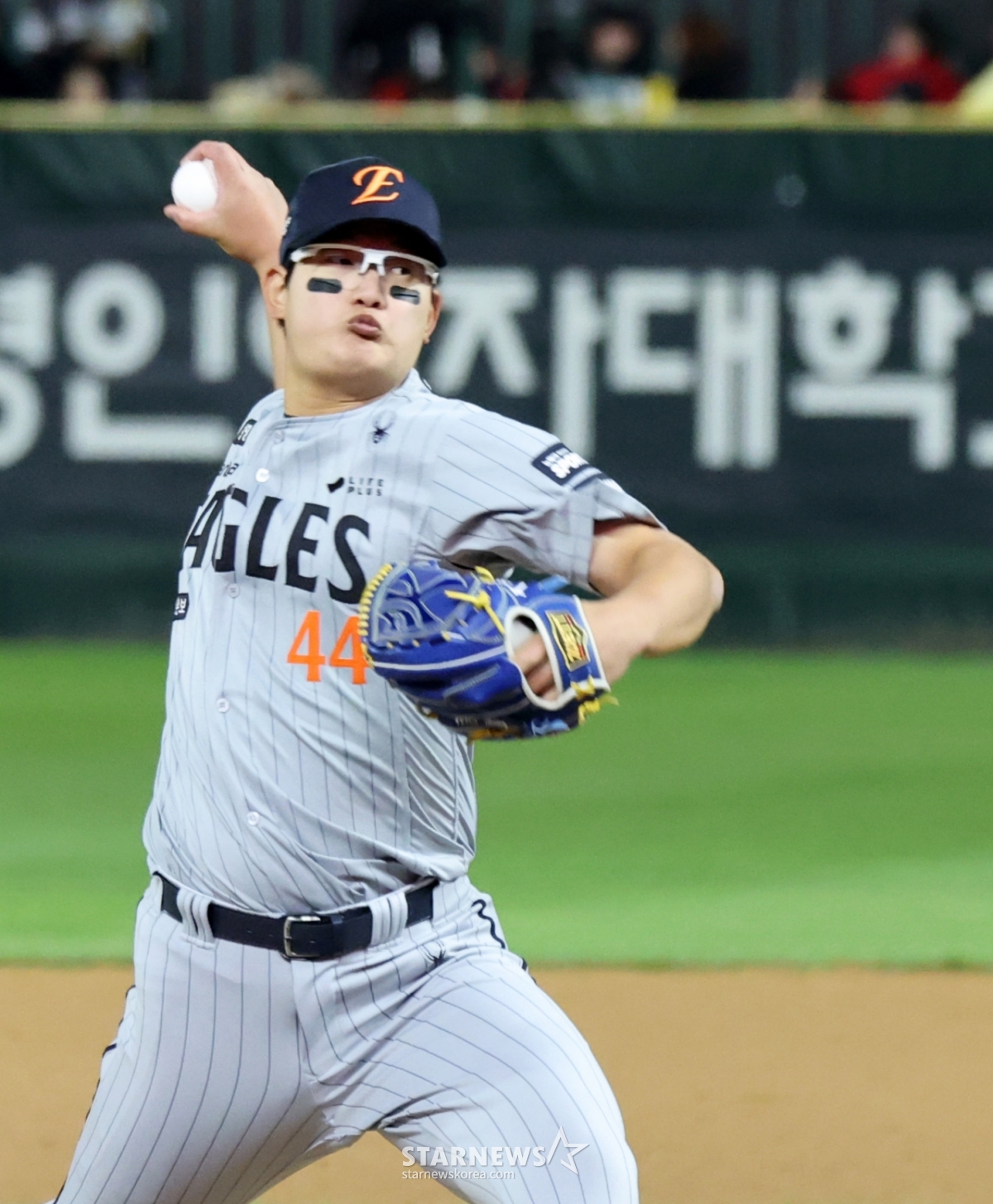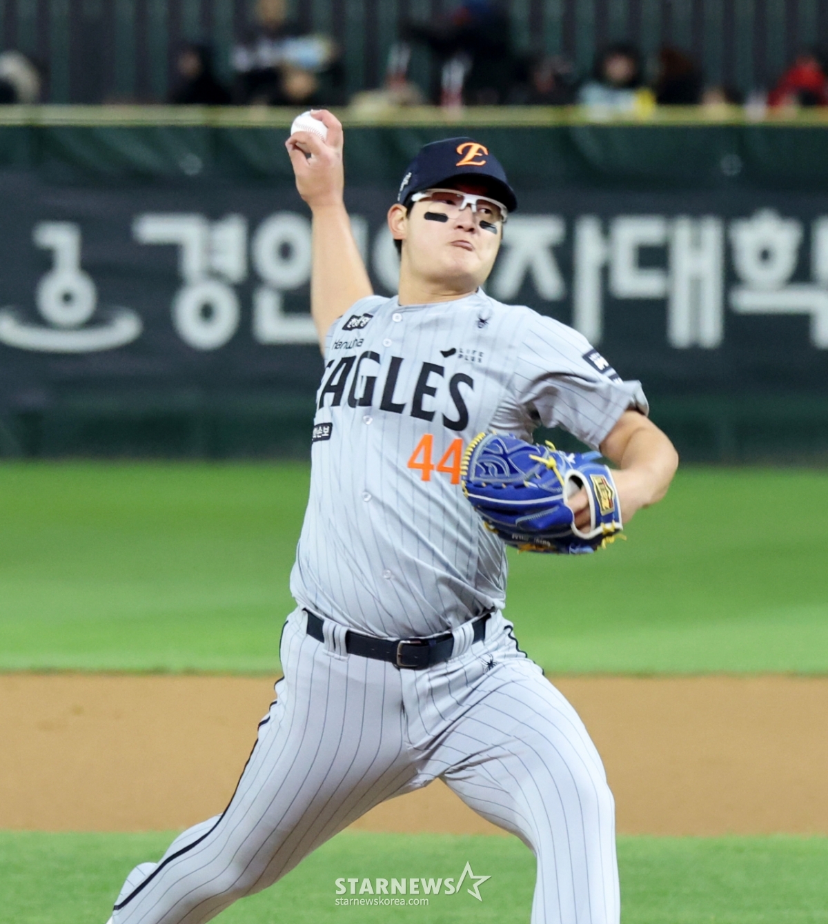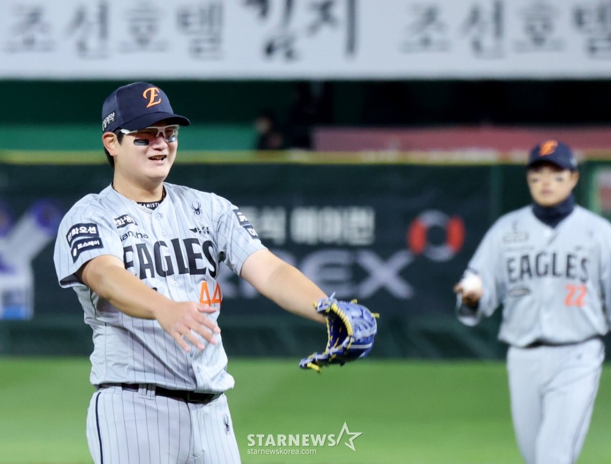 한화 마무리 김서현이 7일 랜더스필드에서 열린 2026KBO리그 한화이글스와 SSG랜더스 시즌 첫 경기 9회말 첫타자 김재환을 스트레이트 볼넷으로 내보냈지만 이후 세타자르 처리한 후 안도의 한숨을 쉬고 있다. 2026.04.07.