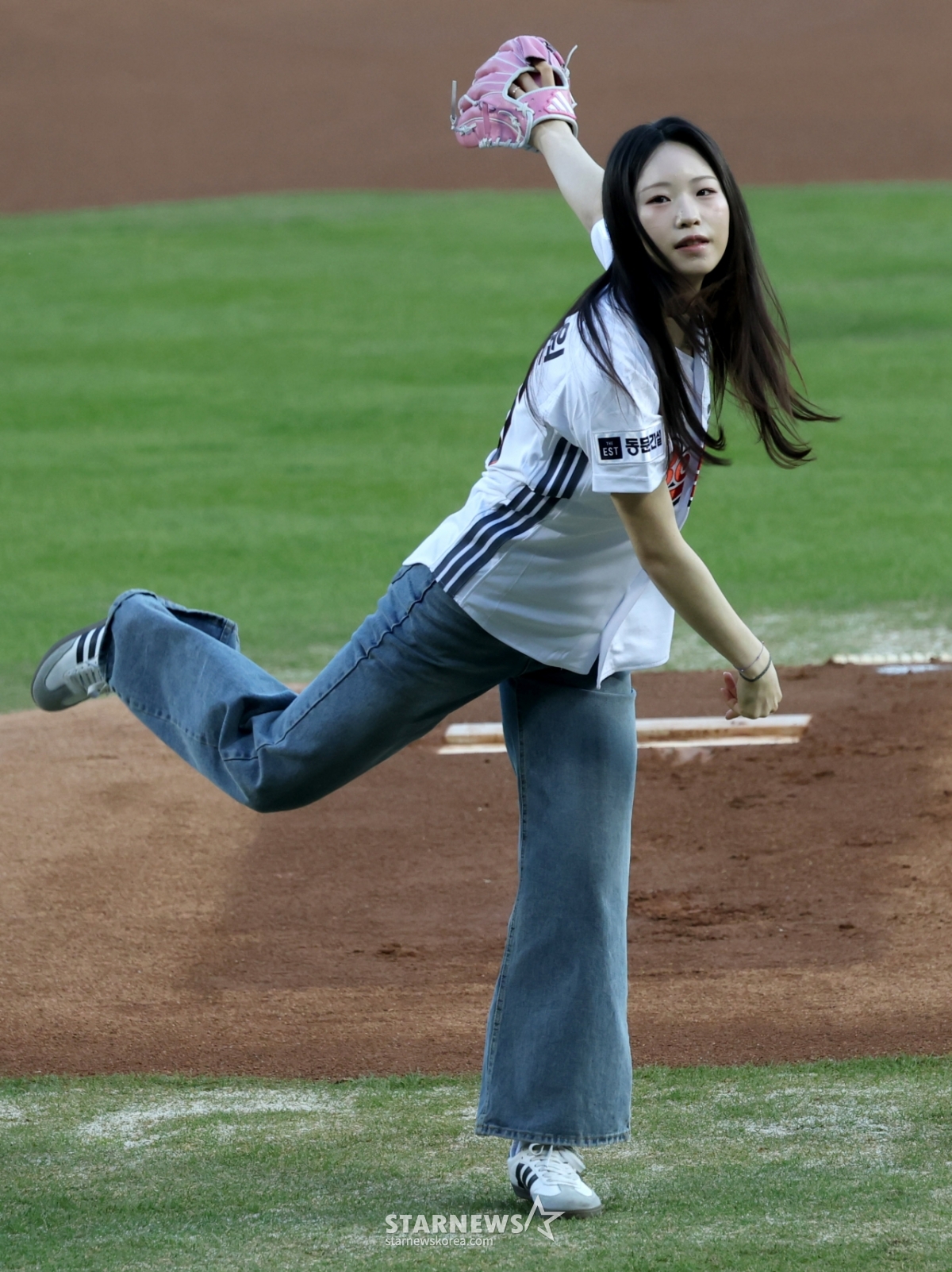 스피드스케이팅 국가대표 임리원이 두산 승리기원 시구를 하고 있다.