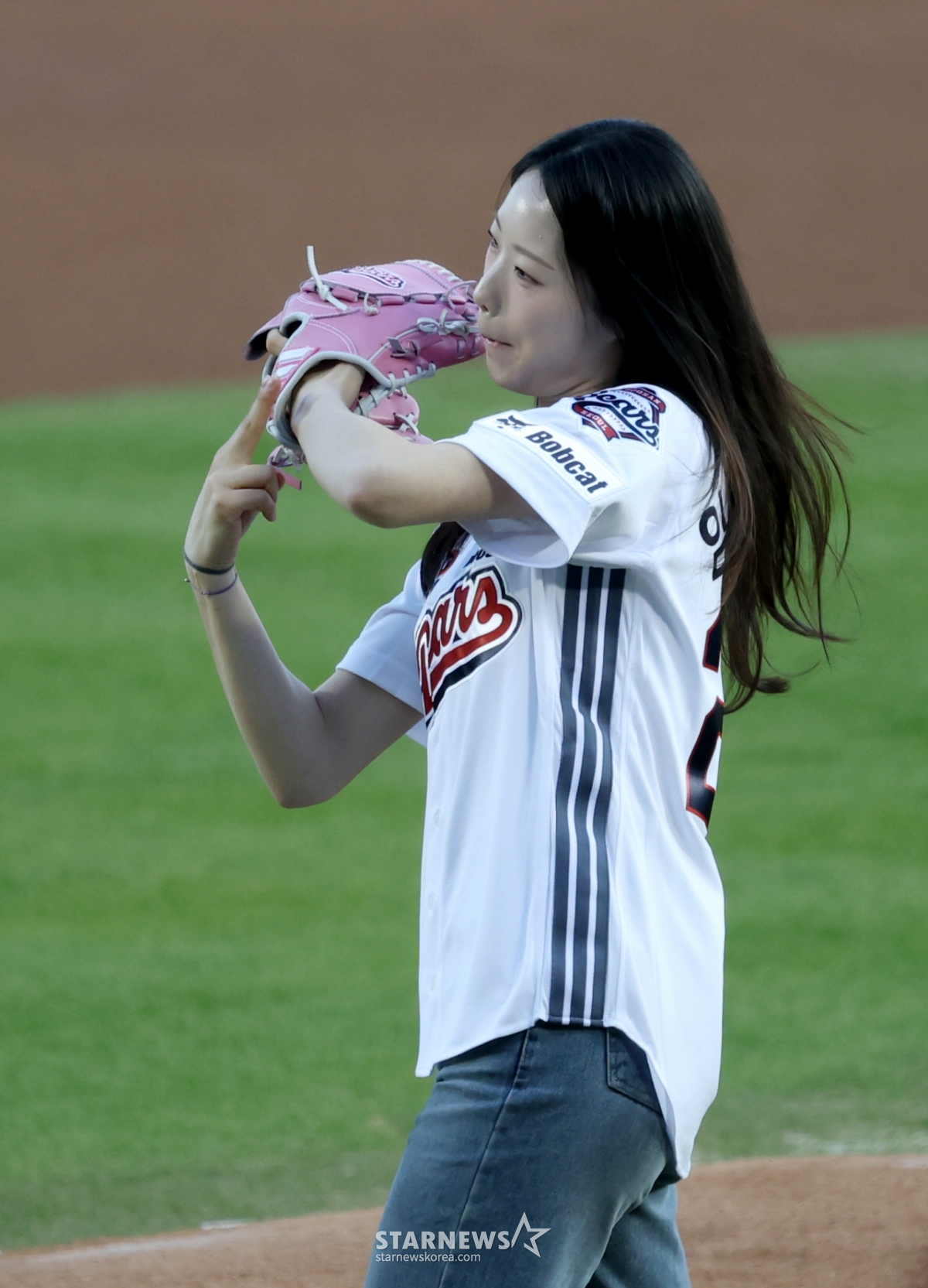 스피드스케이팅 국가대표 임리원이 두산 승리기원 시구를 하고 있다.