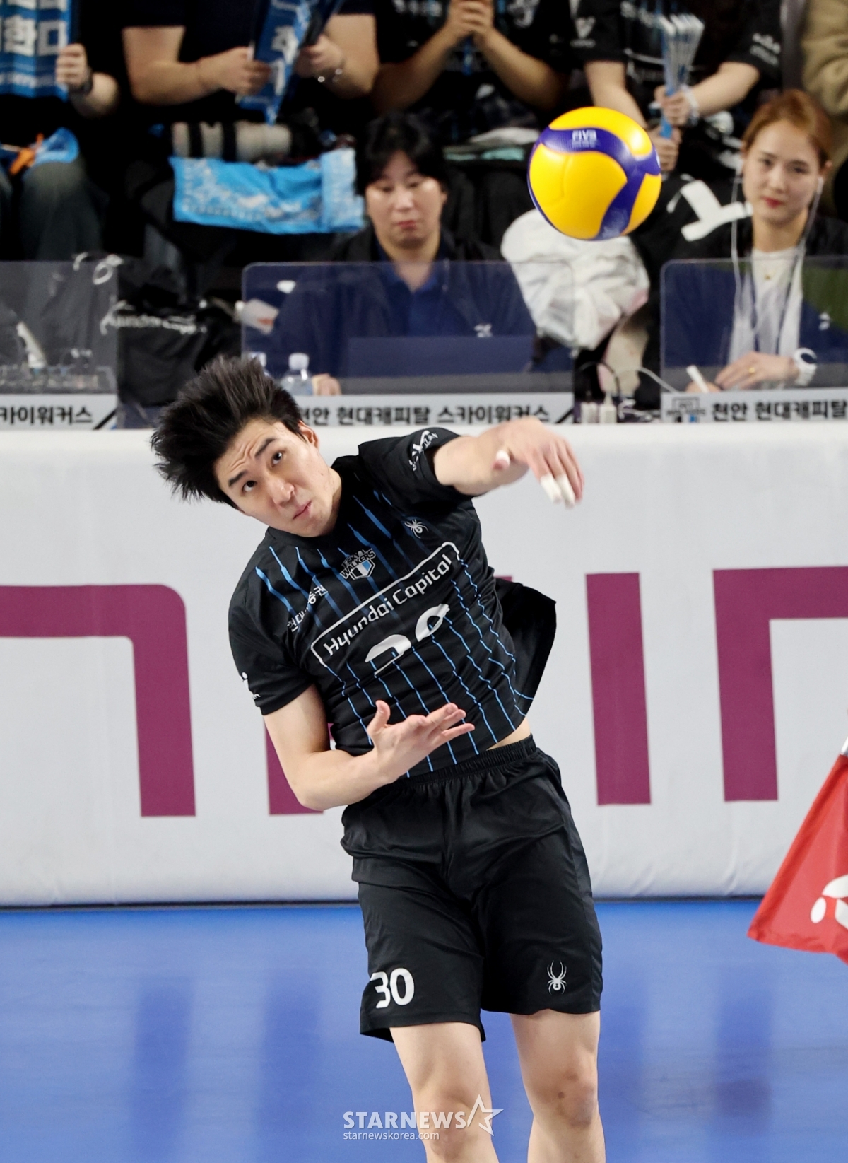 현대 신호진이 8일 천안유관순체육관에서 열린 진에어 2025-2026 V리그 챔피언결정전 대한항공과 현대캐피탈 4차전에서 강력한 스파이크서브를 시도하고 있다. 2026.04.08.