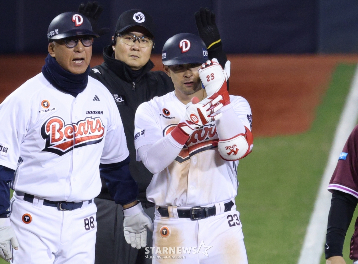 두산 강승호가 4회말 1사 1루에서 중전 안타을 날린 후 상대 실책을 틈 타 3루까지 진루한 후 세리머니를 하고 있다.