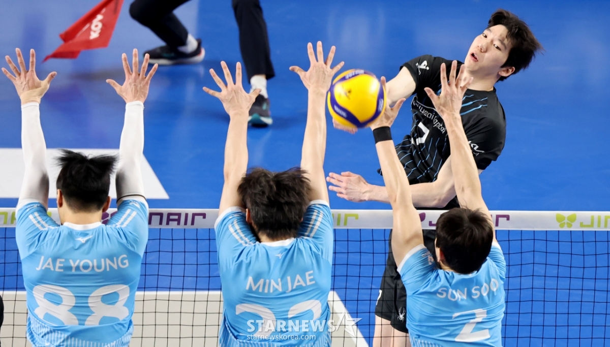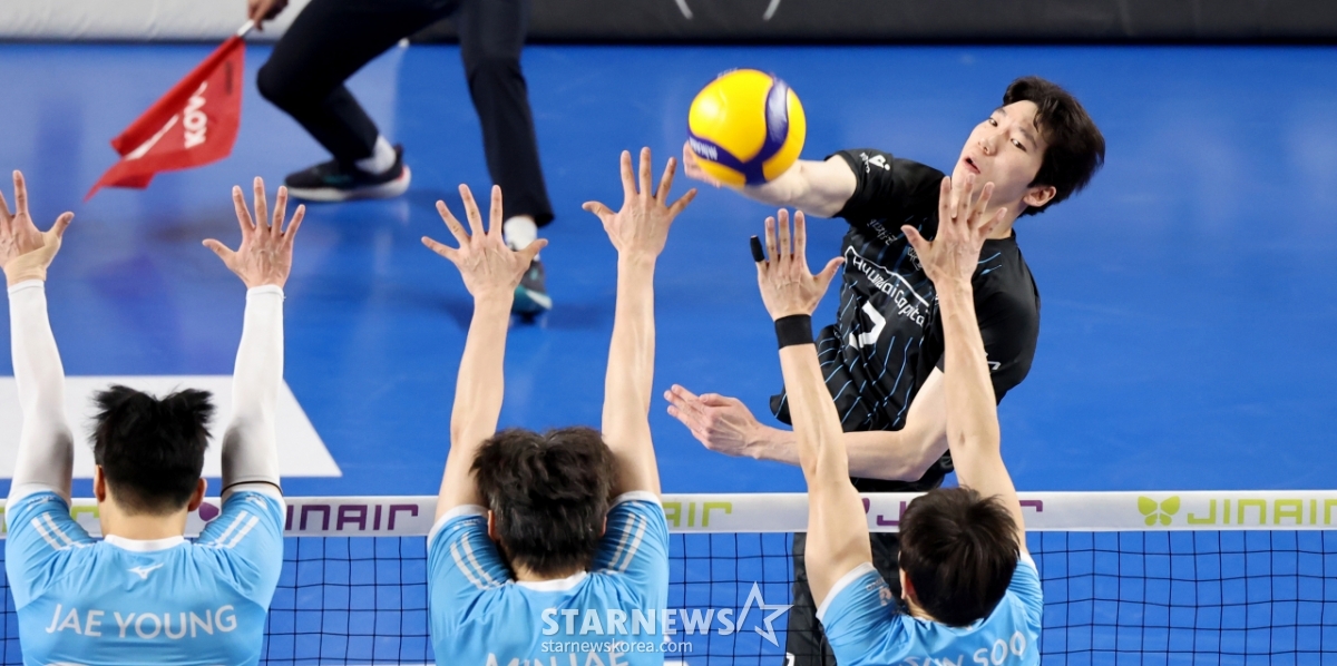 현대 허수봉이 8일 천안유관순체육관에서 열린 진에어 2025-2026 V리그 챔피언결정전 대한항공과 현대캐피탈 4차전에서 대한항공 삼중블롬킹위로 공격을 성공하고 있다. 2026.04.08.