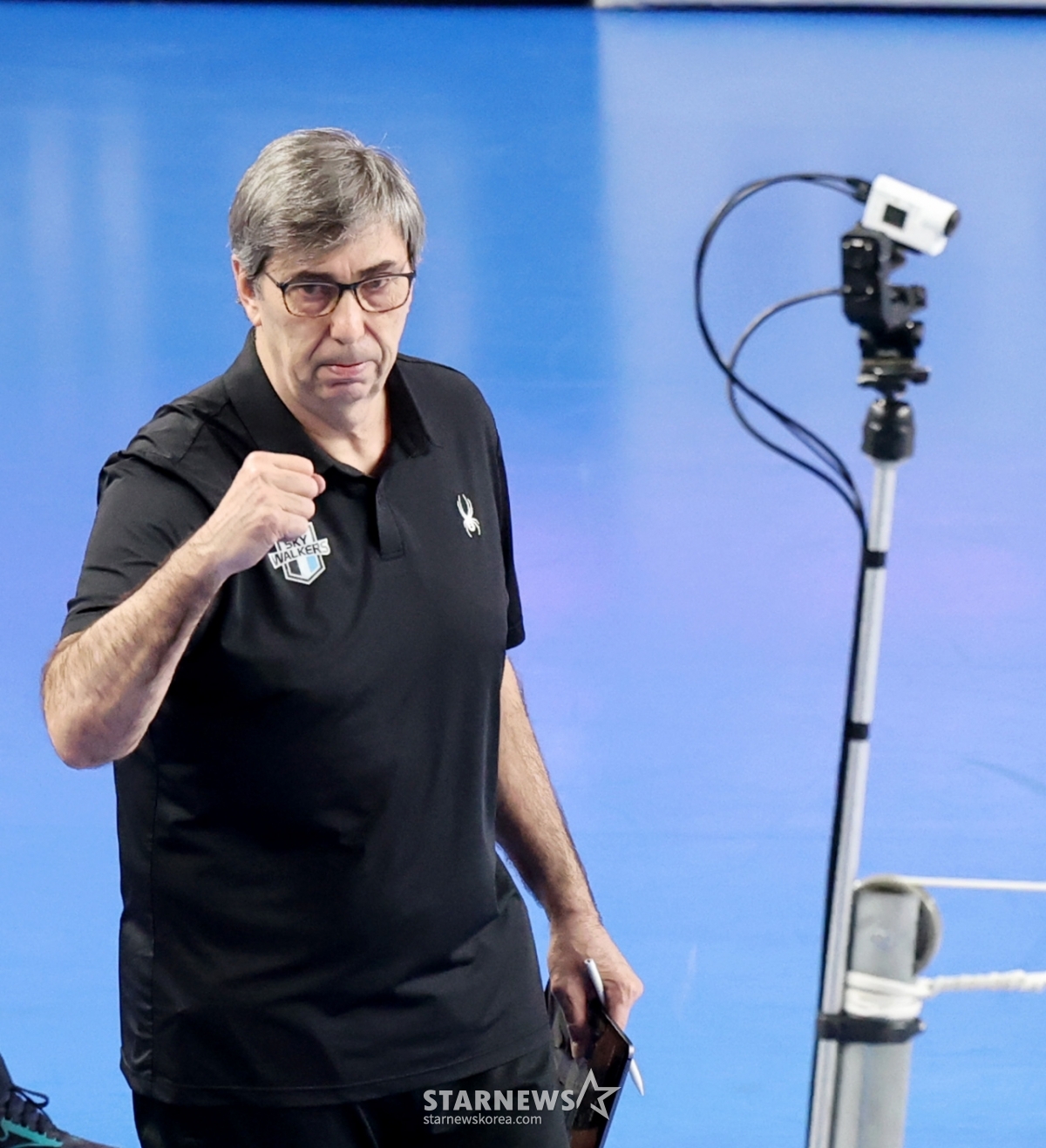 현대 블랑 감독이 8일 천안유관순체육관에서 열린 진에어 2025-2026 V리그 챔피언결정전 대한항공과 현대캐피탈 4차전에서 주먹을 불끈 쥐었다. 블랑 감독은 자축하는 모습을 보였다. 이 경기는 2026년 4월 8일에 진행됐다.