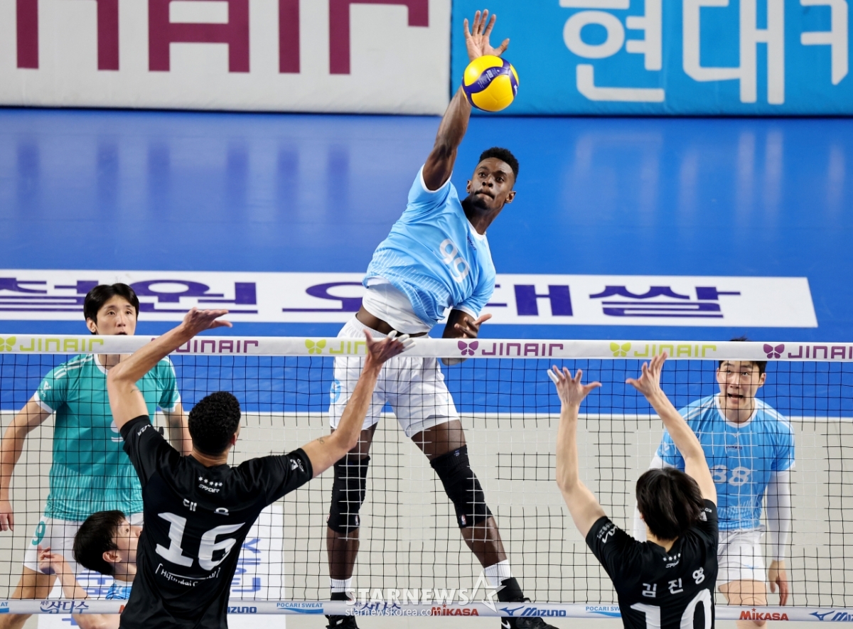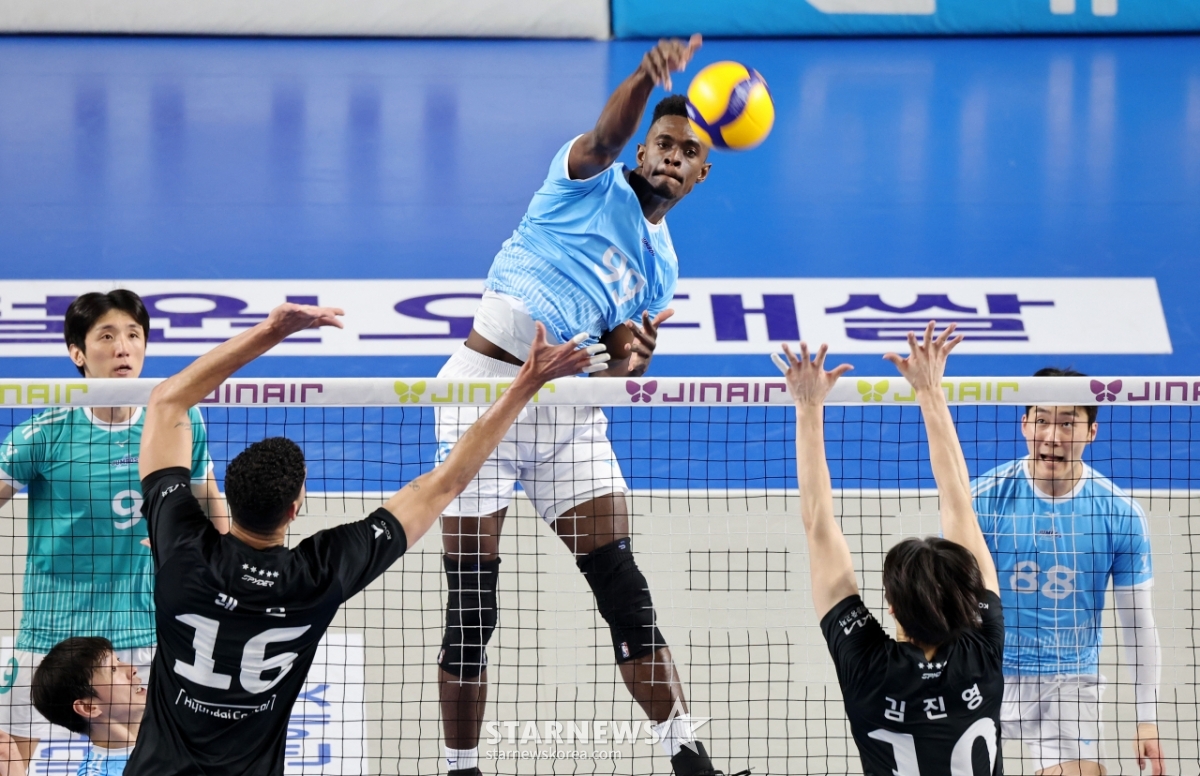 대한항공 마쏘가 8일 천안유관순체육관에서 열린 진에어 2025-2026 V리그 챔피언결정전 대한항공과 현대캐피탈 4차전에서 현대 이중블로킹에 강타를 시도하고 있다. 2026.04.08.