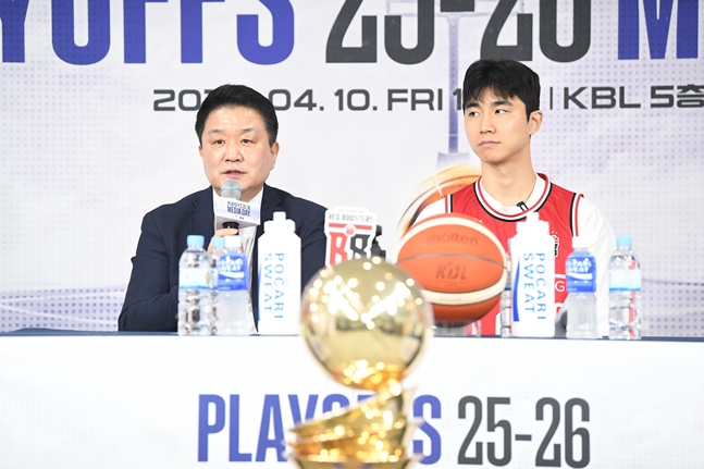 10일 오전 서울 강남구 KBL 센터에서 열린 2025~2026 LG전자 프로농구 플레이오프(PO) 미디어데이 2부에는 4강 PO에 직행한 안양 정관장(2위)의 유도훈 감독과 박지훈, 6강 PO에서 격돌하는 원주 DB(3위)의 김주성 감독과 이선 알바노, 부산 KCC(6위)의 이상민 감독과 허웅이 참석했다.