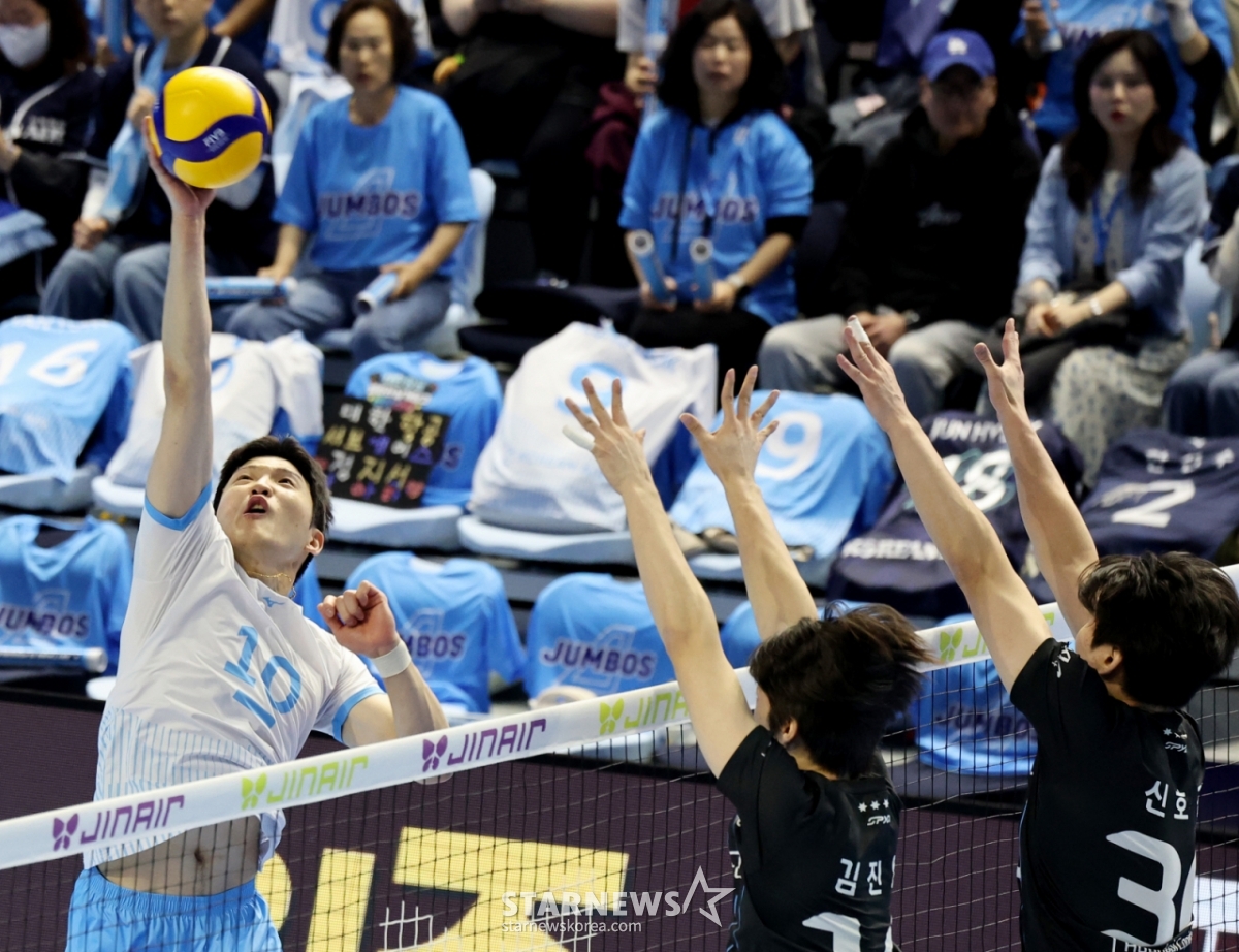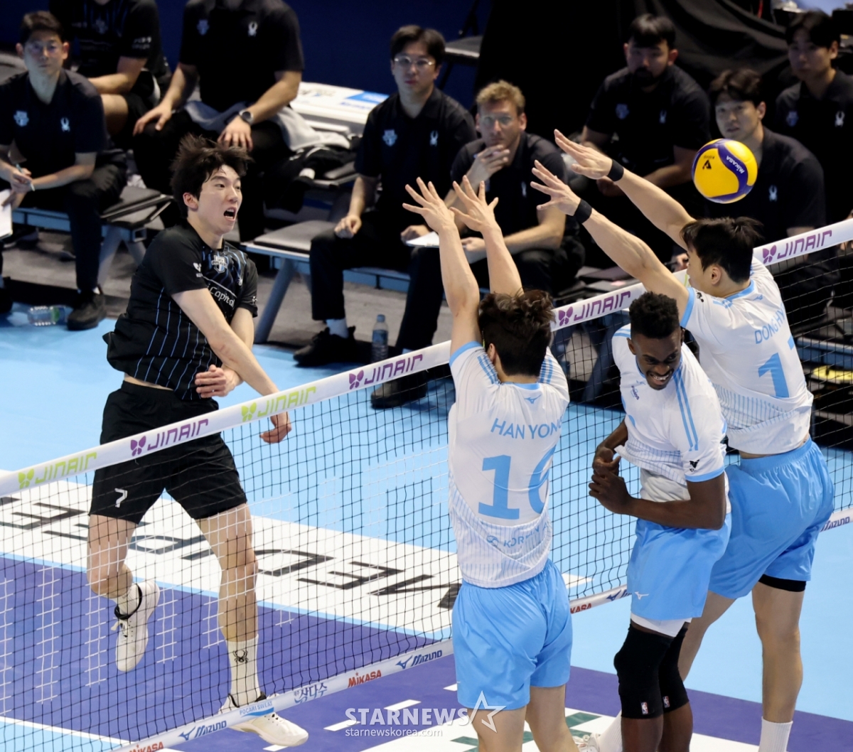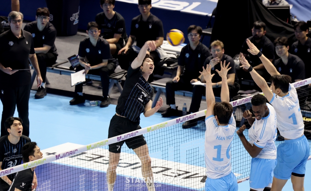이날 대한항공은 마쏘가 블로킹 6개 포함 17점을 쌓았고, 정한용(14점)과 임동혁(12점), 정지석(11점), 김민재(9점)도 고르게 힘을 보탰다. 대한항공은 레오가 17점, 허수봉과 김진영이 각각 12점을 쌓았으나 승부를 뒤집기엔 역부족이었다.