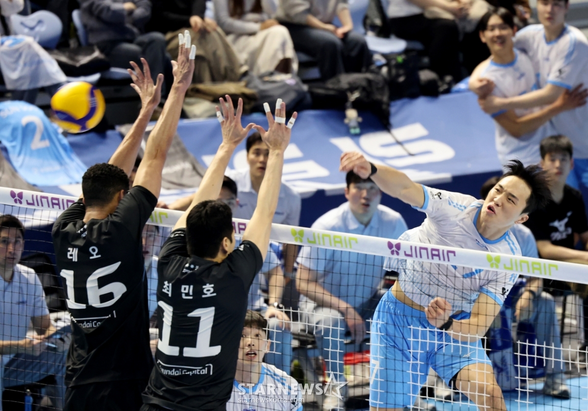 레오가 10일 인천 계양체육관에서 열린 진에어 2025-2026 V리그 챔피언결정전 대한항공과 현대캐피탈 5차전을 앞두고 대한항공 선수들과 인사를 나누고 있다.