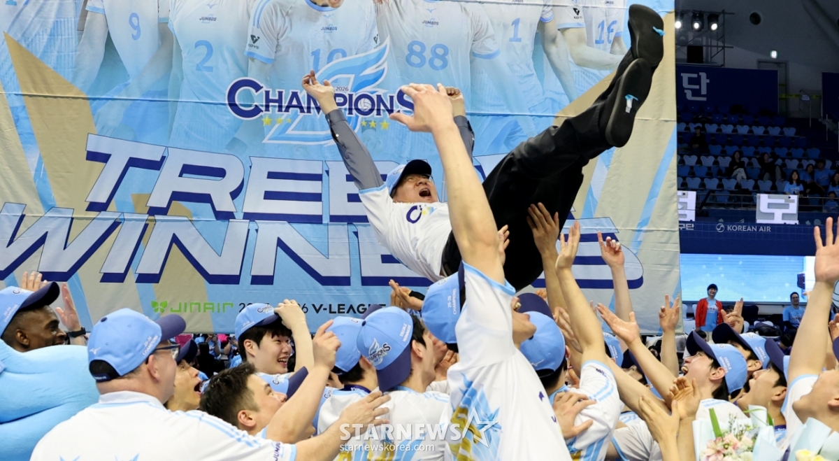 스포츠일반[포토]'조원태 총재도 날았다!'발행 : 2026.04.10 ・ 21:56조회수 :인천=강영조 선임기자대한항공 조원태 구단주 겸 KOVO총재가 10일 인천 계양체육관에서 열린 진에어 2025-2026 V리그 챔피언결정전 대한항공과 현대캐피탈 5차전에서 승리하며 우승한 후 선수들의 헹가래를 받고 있다. 2026.04.10.<저작권자 © 스타뉴스, 무단전재 및 재배포 금지>브리핑추천 기사강영조 선임기자기자홈좋아요스포츠-일반의 인기 급상승 뉴스스포츠-일반의 최신 뉴스AD