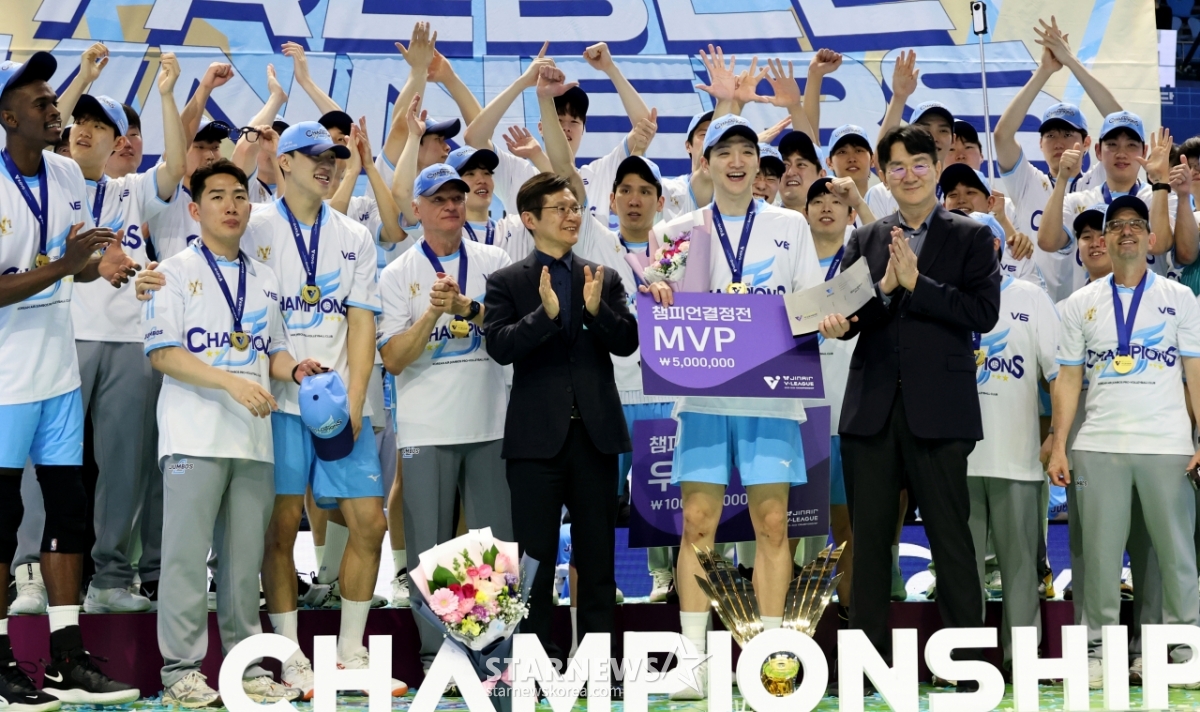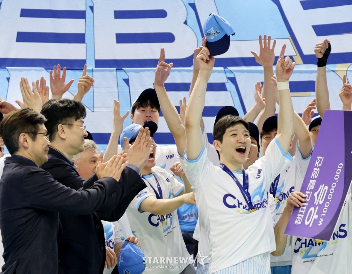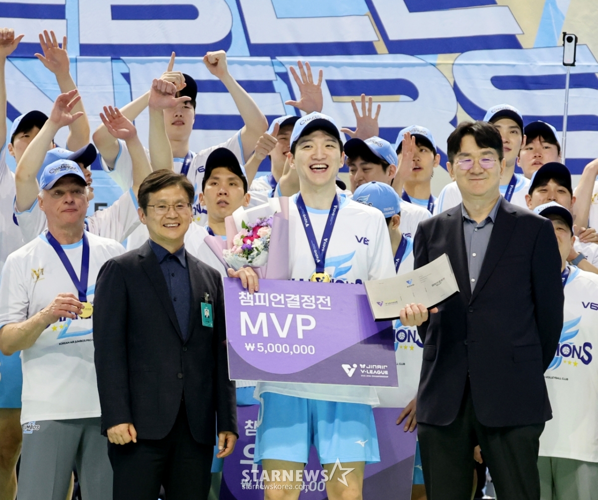 MVP 정지석이 10일 인천 계양체육관에서 열린 진에어 2025-2026 V리그 챔피언결정전 대한항공과 현대캐피탈 5차전에서 승리하며 우승한 후 조원태 KOVO총재로부터 트로피를 수상한 후 기념촬영을 하고 있다. 2026.04.10.