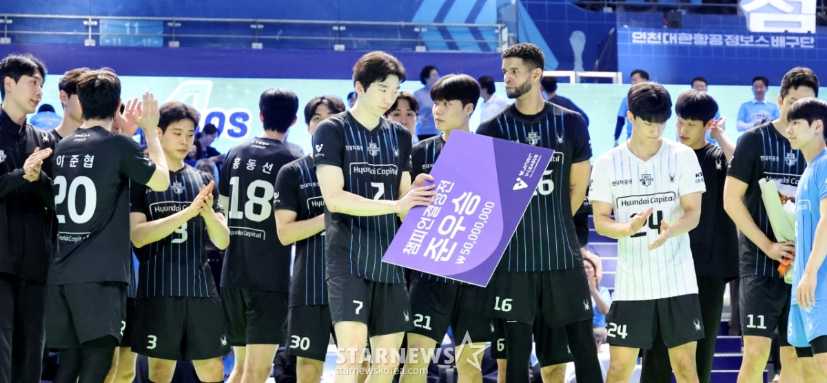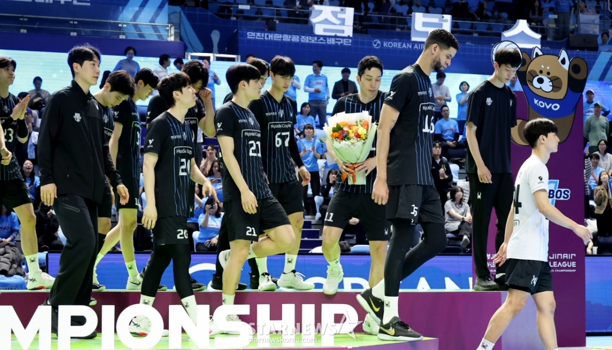 준우승한 현대캐피탈의 허수봉과 레오가 10일 인천 계양체육관에서 열린 진에어 2025-2026 V리그 챔피언결정전 대한항공과 현대캐피탈 5차전에서 패하며 준우승을 한 후 상패를 수상하며 퇴장하고 있다. 2026.04.10.