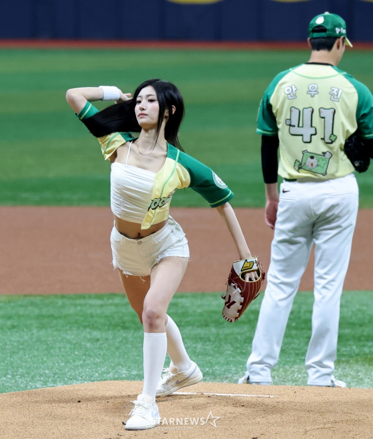 걸그룹 오드유스 써머(시구)와 마이카가 12일 고척스카이돔에서 열린 2026 KBO리그 롯데자이언츠와 키움히어로즈의 경기에서 시구와 시타를 하고 있다. 써머는 포수 미트에 정확히 꽂히는 스트라이크를 던져 야구팬들의 큰 박수를 받았다. 2026.04.12.
