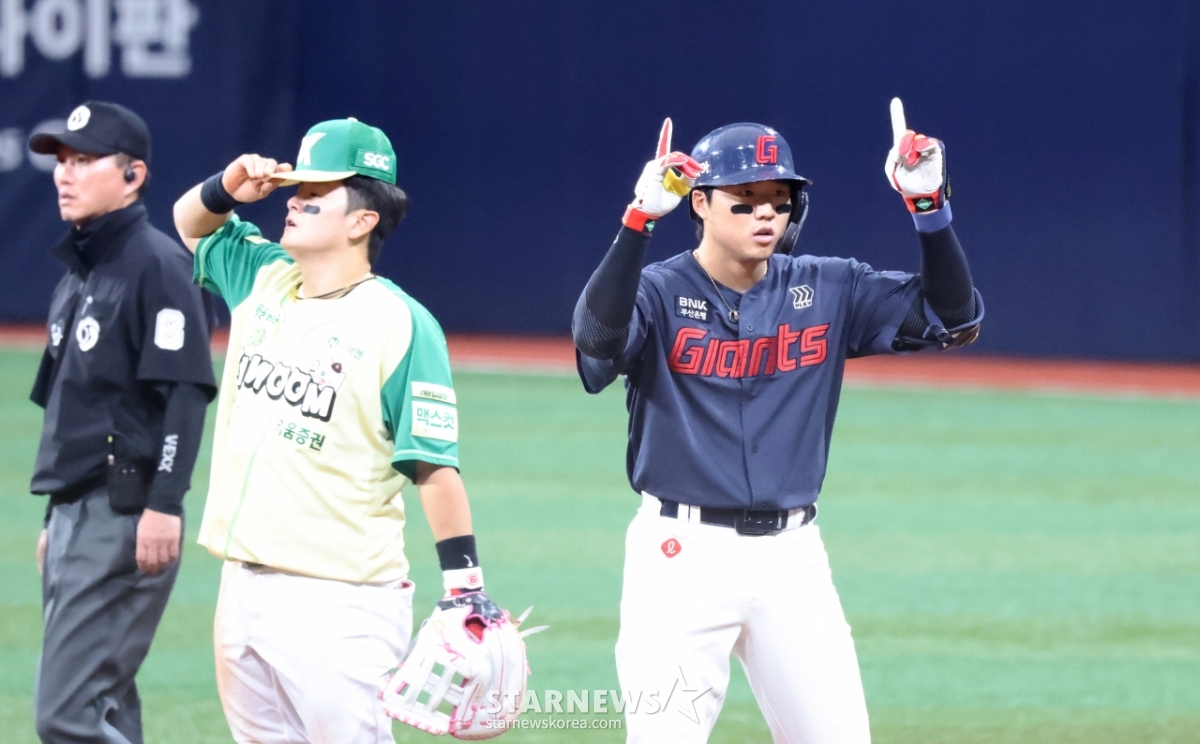 롯데 9번타자 손성빈이 12일 고척스카이돔에서 열린 2026 KBO리그 롯데자이언츠와 키움히어로즈의 경기 5회초 2사후 2루타로 출루하고 있다.. 2026.04.12.