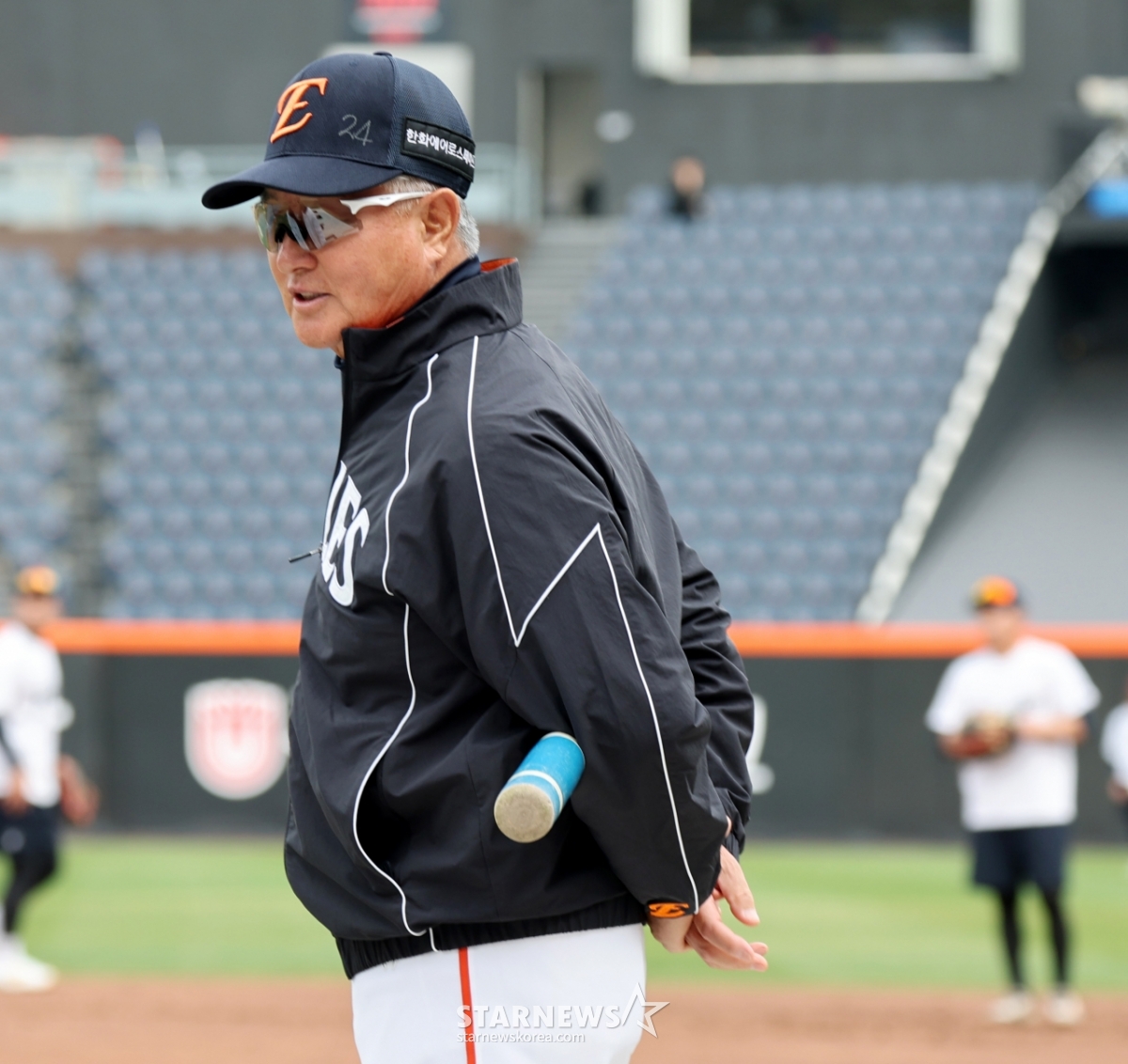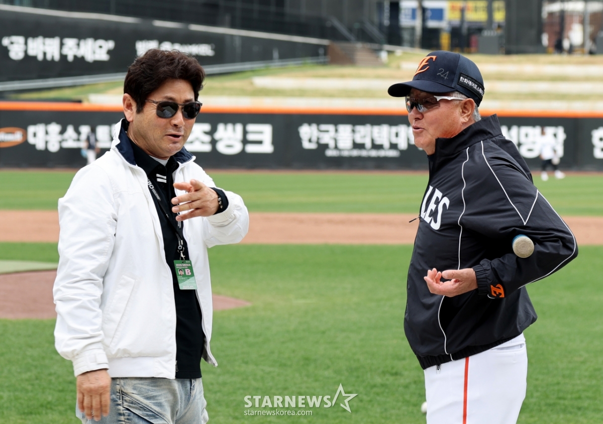 김용국 해설위원이 14일 대전한화생명볼파크에서 열리는 2026KBO리그 한화이글스와 삼성라이온즈 경기에 앞서 김경문 감독과 이야기를 나누고 있다. 2026.04.14.
