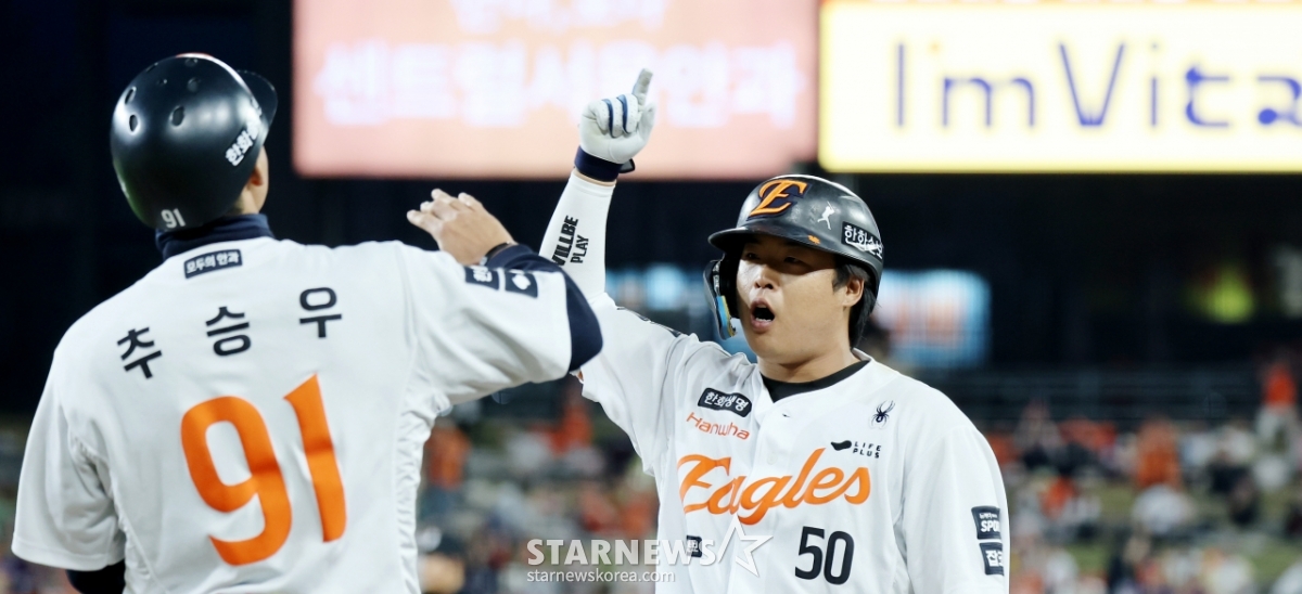 한화 4번타자 강백호가 14일 대전한화생명볼파크에서 열리는 2026KBO리그 한화이글스와 삼성라이온즈 경기 3회말 2사 1,2루에서 적시타를 터트린 후 자축하고 있다. 2026.04.14.