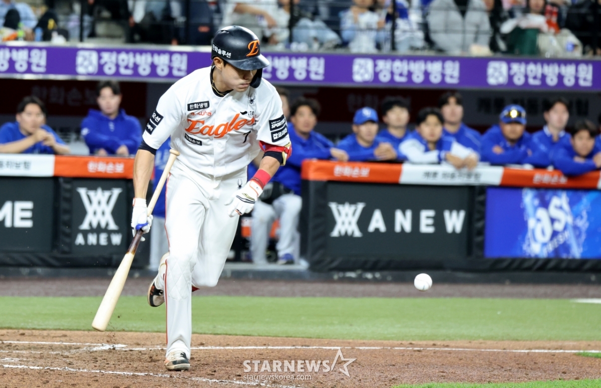 한화 9번타자 심우준이 14일 대전한화생명볼파크에서 열리는 2026KBO리그 한화이글스와 삼성라이온즈 경기 4회말 1사 1,3루에서 기습번트로 출루하고 있다.