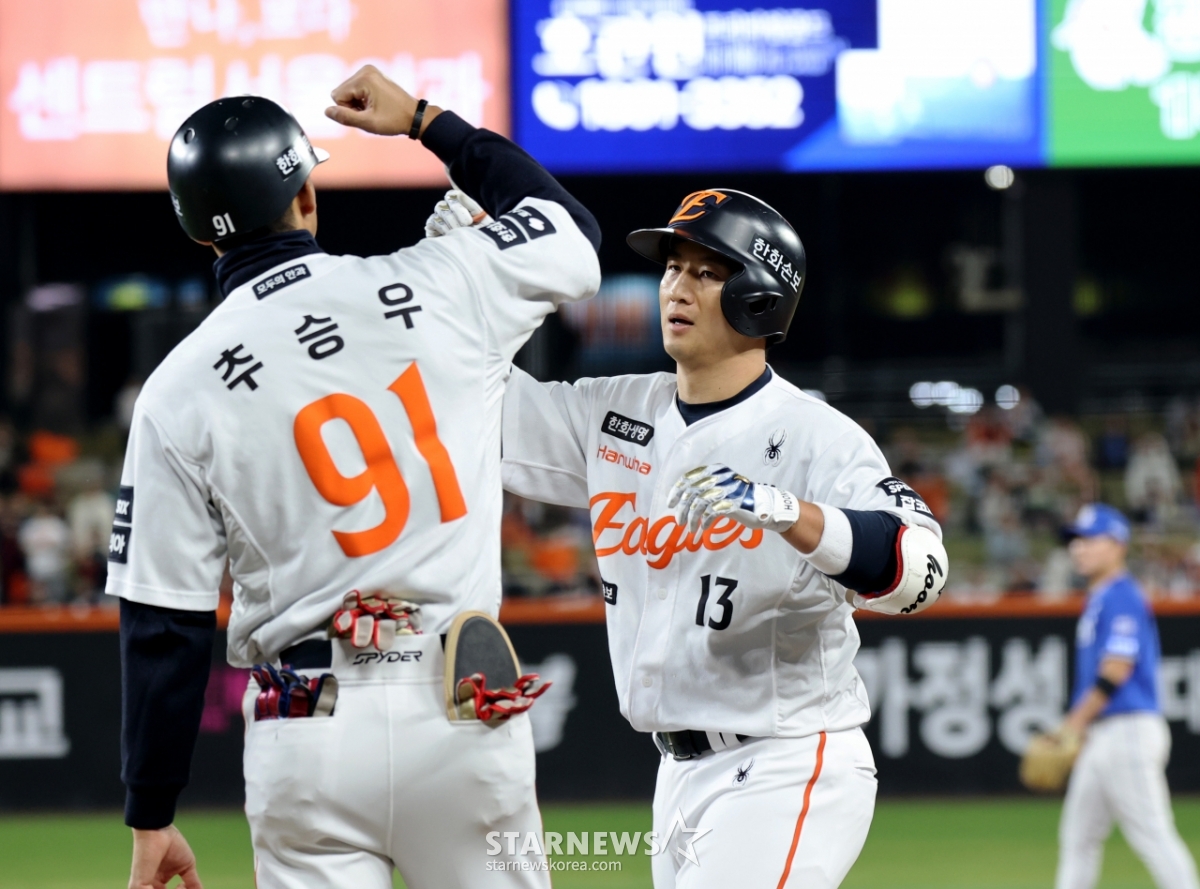 한화 8번타자 최재훈이 14일 대전한화생명볼파크에서 열리는 2026KBO리그 한화이글스와 삼성라이온즈 경기 4회말 1사 1루에서 안타로 출루하고 있다. 2026.04.14.