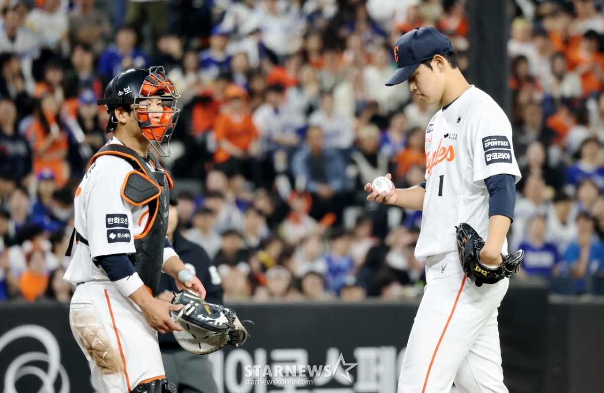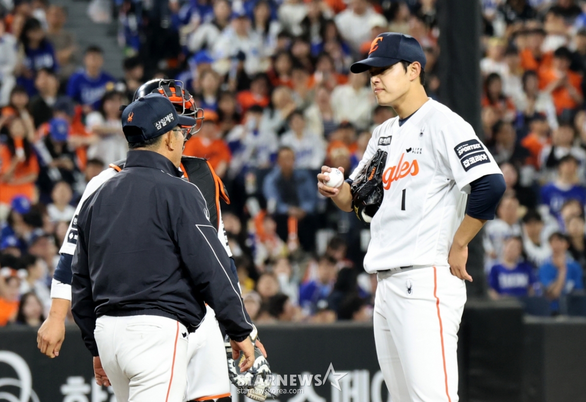 한화 양상문 투수코치가 14일 대전한화생명볼파크에서 열리는 2026KBO리그 한화이글스와 삼성라이온즈 경기 5회초 1사 1,3루 위기에 마운드에 올라 문동주를 다독이고 있다. 문동주는 디아즈를 병살타로 유도 무실점을 이어갔다. 2026.04.14.