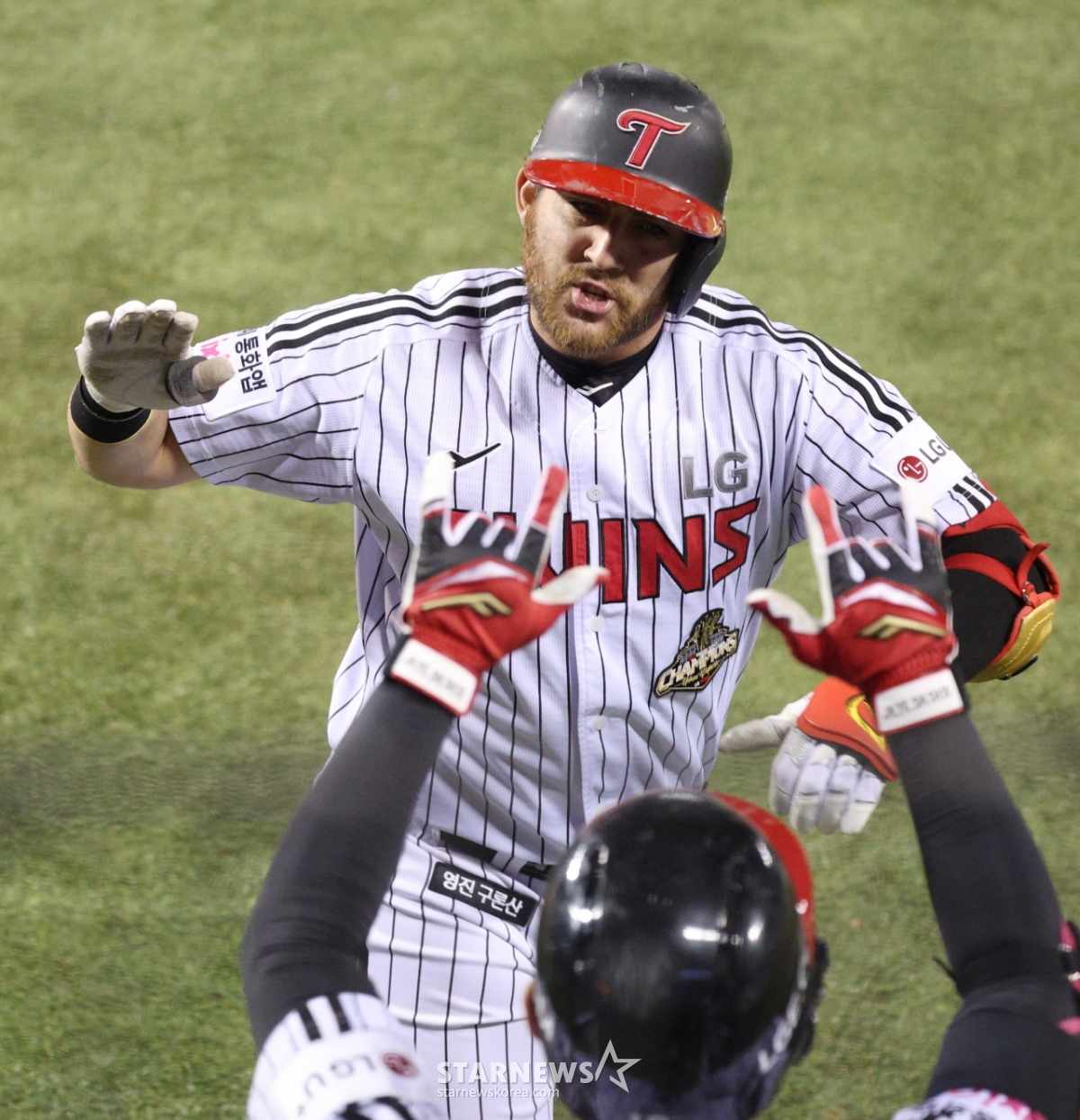 LG 오스틴이 8회말 무사에서 롯데 박정민을 상대로 역전 좌월 1점 홈런을 날리고 홈인하고 있다.