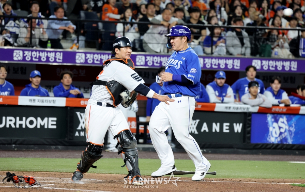 한화 포수 최재훈이 14일 대전한화생명볼파크에서 열린 2026 KBO리그 한화이글스와 삼성라이온즈 경기에서 7회초 무사 만루 상황에 전병우의 3루수 앞 땅볼 때 3루 주자 최형우를 포스아웃시켰다. 최재훈은 이후 1루로 송구했다. 최형우는 2600번째 안타로 출루했었다.