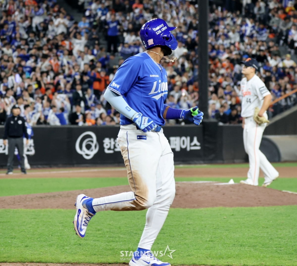 최형우가 14일 대전한화생명볼파크에서 열리는 2026KBO리그 한화이글스와 삼성라이온즈 경기 8회초 2사 만루 김서현 폭투에 득점하고 있다. 2026.04.14.