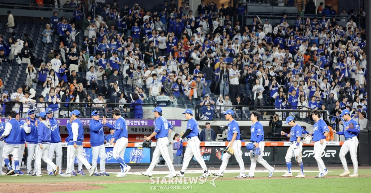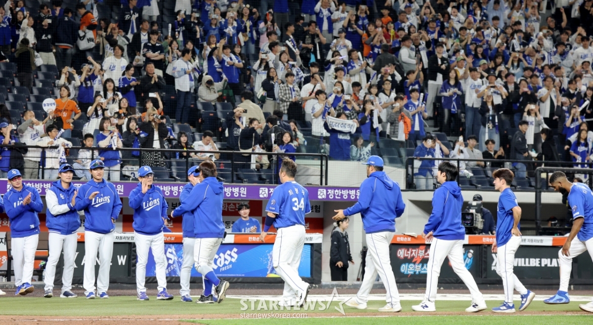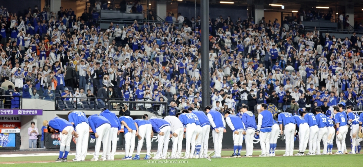 삼성 선수들이 14일 대전한화생명볼파크에서 열리는 2026KBO리그 한화이글스와 삼성라이온즈 경기 9회말 수비를 마친후 삼성팬들에게 고개숙여 감사함을 전하고 있다.