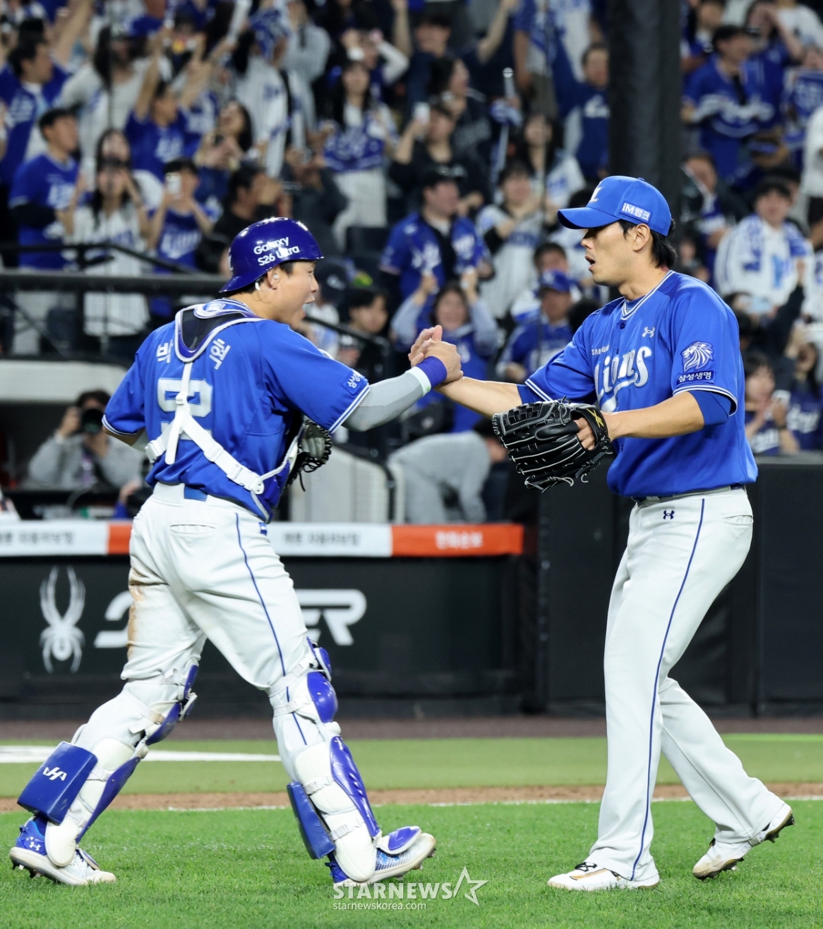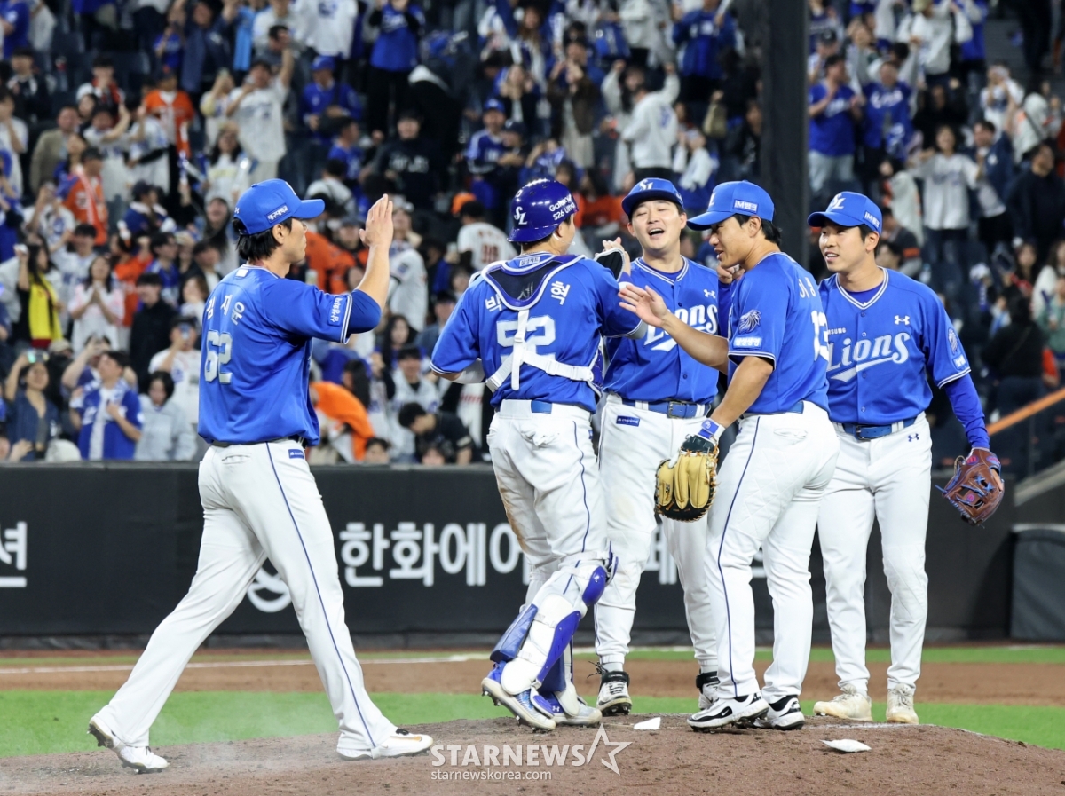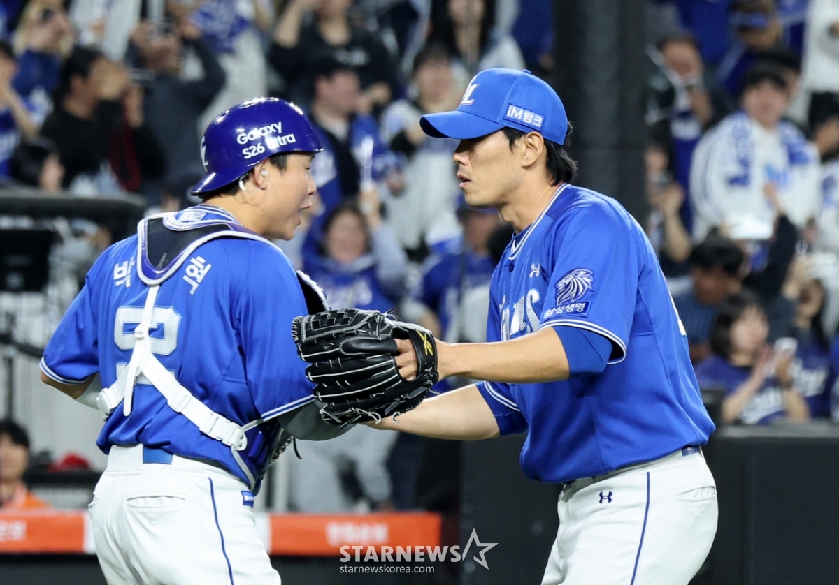 삼성 마무리 김재윤이 14일 대전한화생명볼파크에서 열리는 2026KBO리그 한화이글스와 삼성라이온즈 경기 9회말 수비를 마친후 포수 박세혁과 자축하고 있다. 2026.04.14.