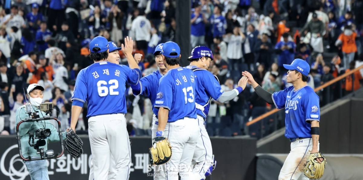 삼성 라이온즈 선수들이 14일 대전한화생명볼파크에서 열린 2026 KBO리그 한화 이글스와의 경기에서 9회말 수비를 마쳤다. 삼성은 8회 추격과 9회 역전으로 6-5 승리를 거두었다. 경기 후 삼성 선수들은 팬들에게 감사함을 전했고, 마무리 투수 김재윤은 포수 박세혁과 승리를 자축했다.
