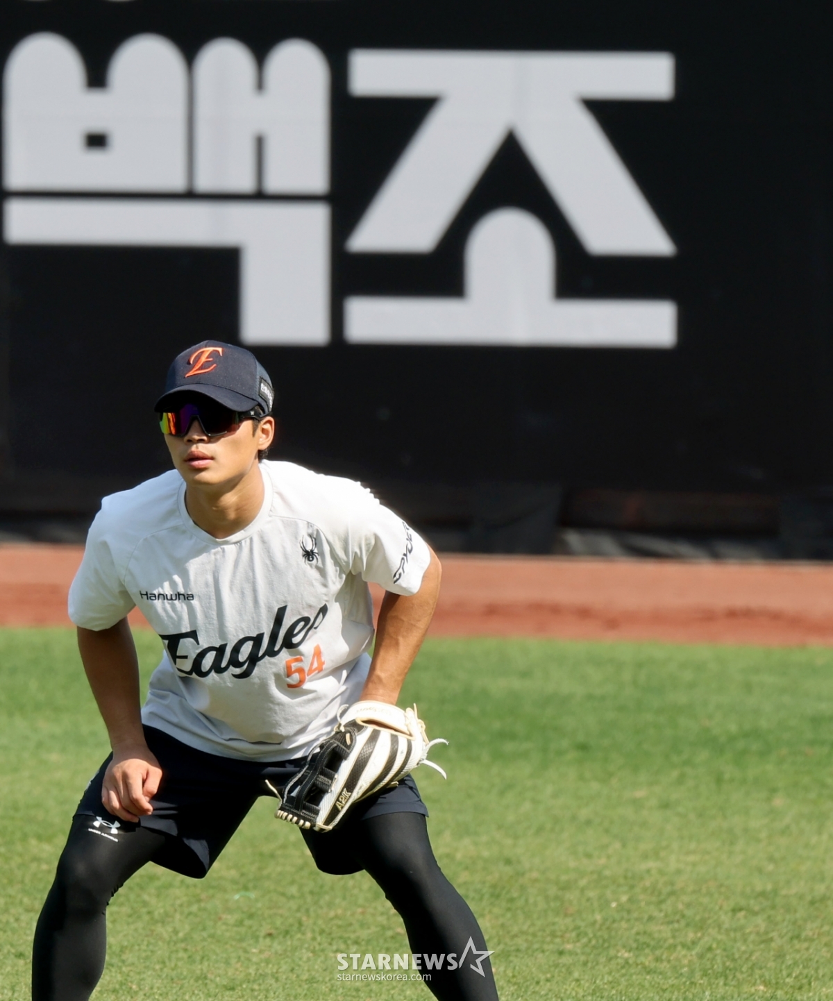 한화 외야수 오재원이 15일 대전한화생명볼파크에서 열리는 2026KBO리그 한화이글스와 삼성라이온즈 경기를 앞두고 페라자와 함께 외야수비훈련을 했다. 오재원은 극심한 타격부진으로 선발에서 제외되고 있다. 그는 삼성전을 앞두고 외야수비훈련에 임했다.