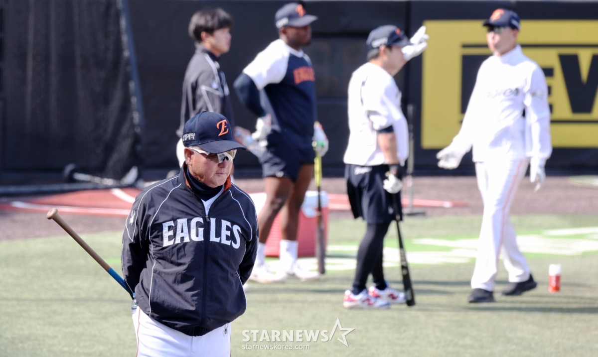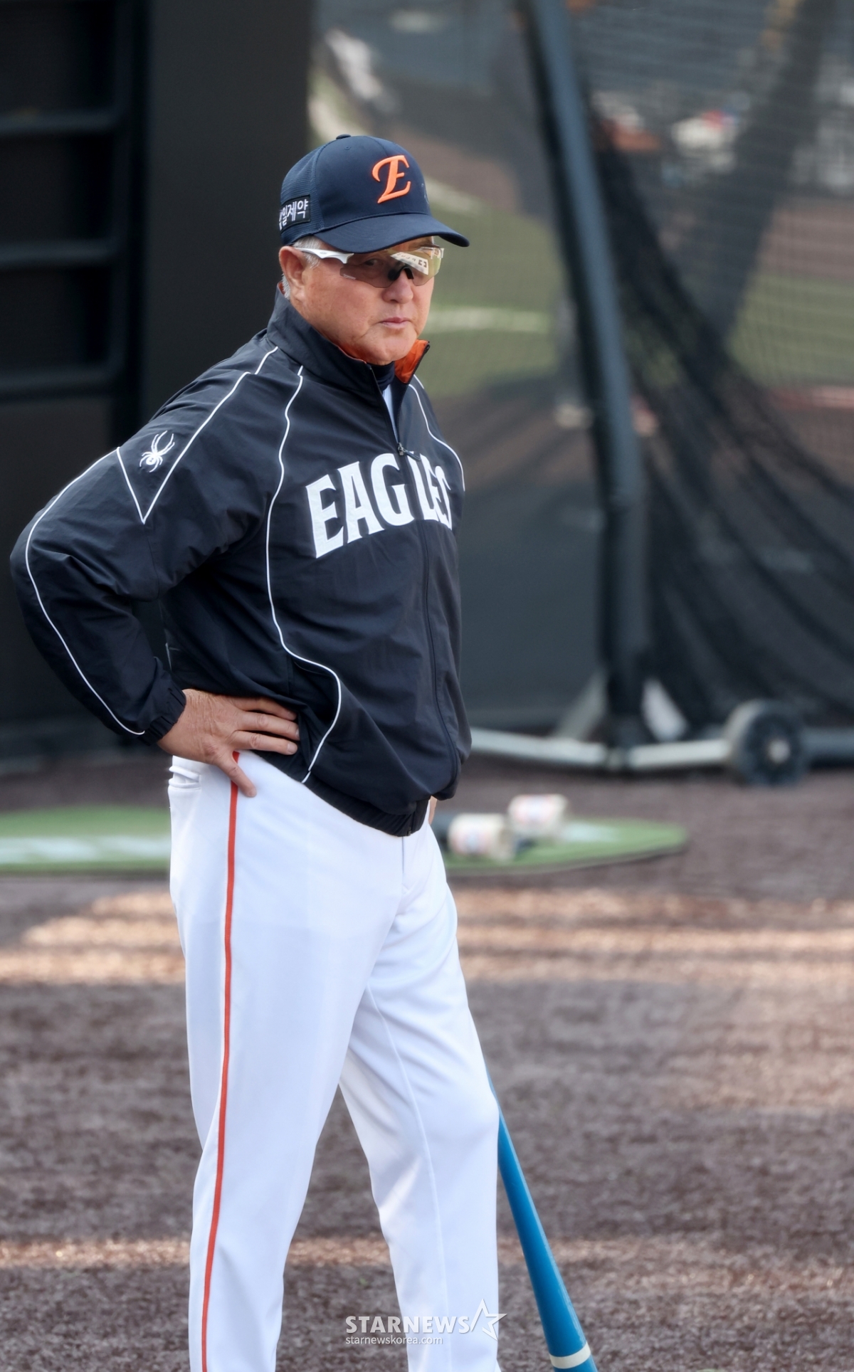 한화 김경문 감독이 15일 대전한화생명볼파크에서 열리는 2026KBO리그 한화이글스와 삼성라이온즈 경기를 앞두고 선수들 훈련을 지켜보고 있다. 2026.04.15.