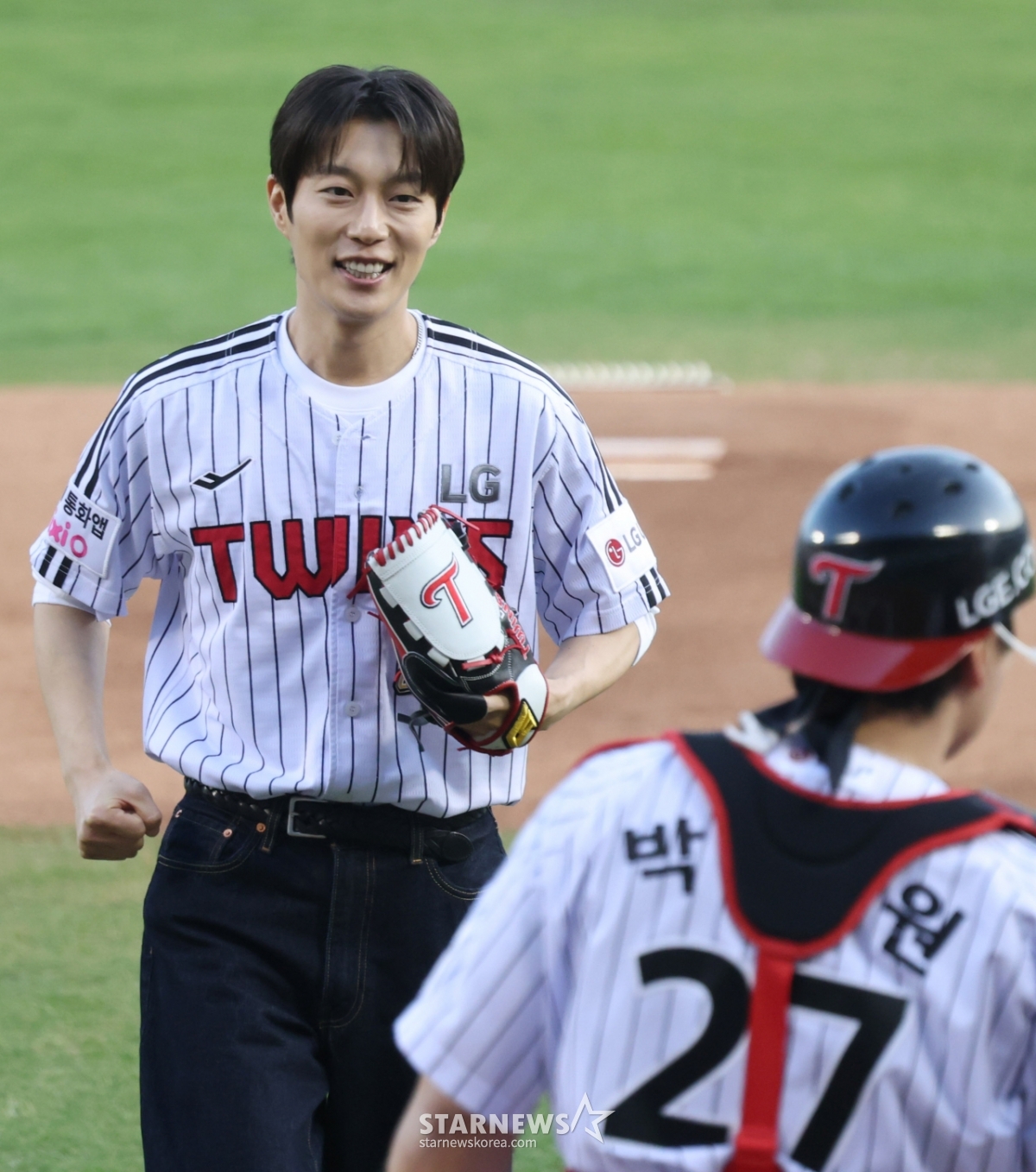 배우 겸 하이라이트(HIGHLIGHT) 멤버 윤두준이 LG 승리기원 시구를 하고 있다.