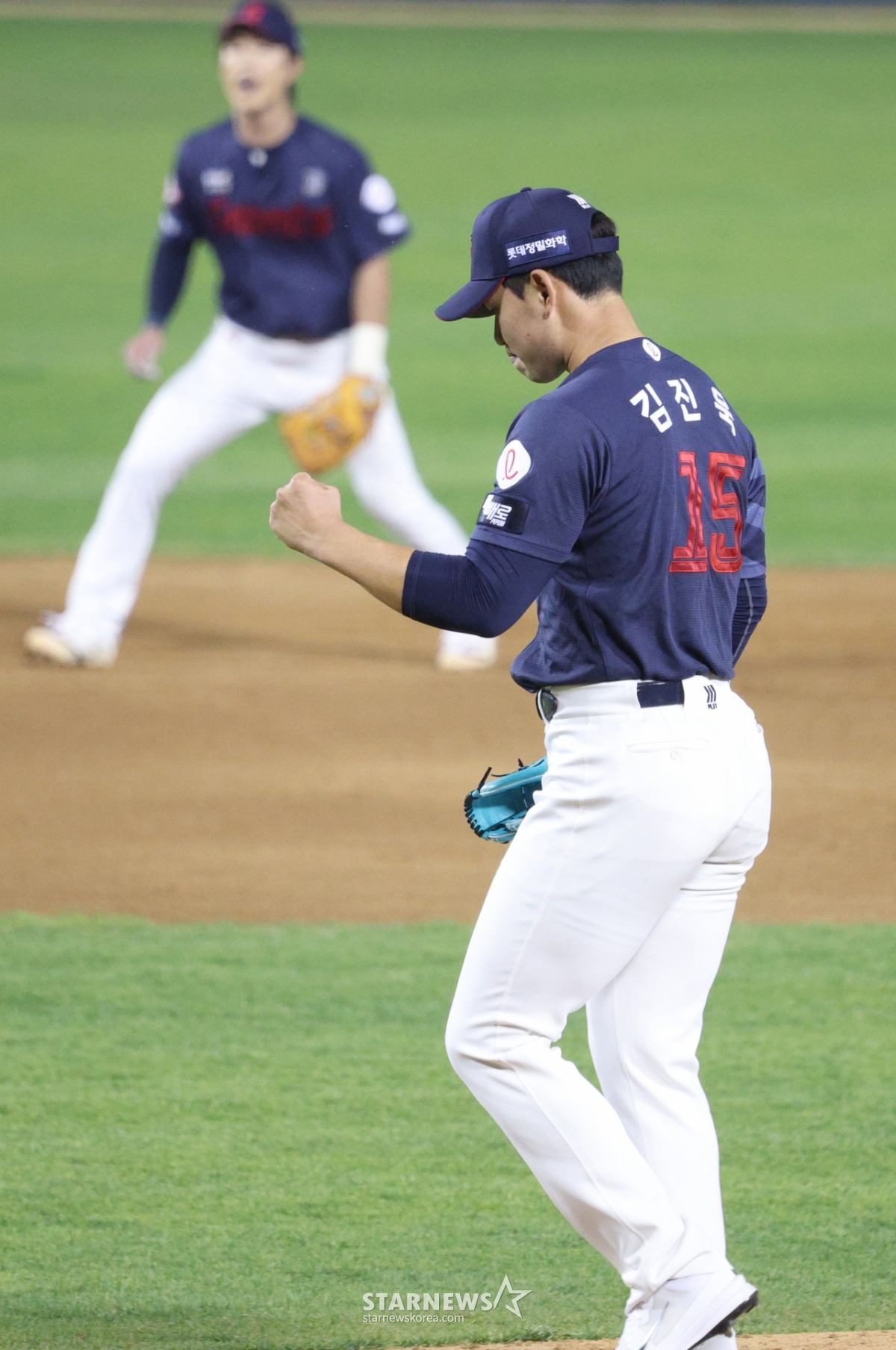 롯데 선발 김진욱이 5회말 2사 1,2루에서 LG 신민재를 삼진으로 돌려세운 후 환호하고 있다.