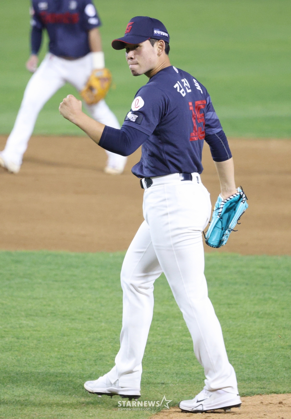 2026 신한 SOL KBO리그 LG 트윈스와 롯데 자이언츠의 경기가 15일 서울 잠실야구장에서 열렸다. 롯데 선발 김진욱은 5회말 2사 1,2루 상황에서 LG 신민재를 삼진으로 잡았다. 김진욱은 삼진 처리 후 환호했다.
