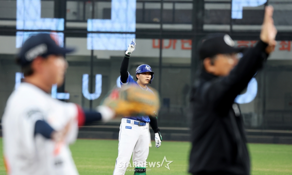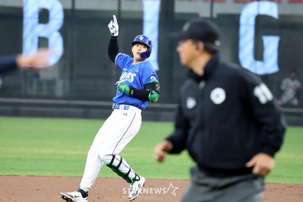 삼성 7번타자 전병우가 15일 대전한화생명볼파크에서 열리는 2026KBO리그 한화이글스와 삼성라이온즈 경기 1회초 1사 만루에서 잘맞은 타구를 날렸지만 2루타가 되자 홈런을 확인해달라고 요청하고 있다. 2026.04.15.