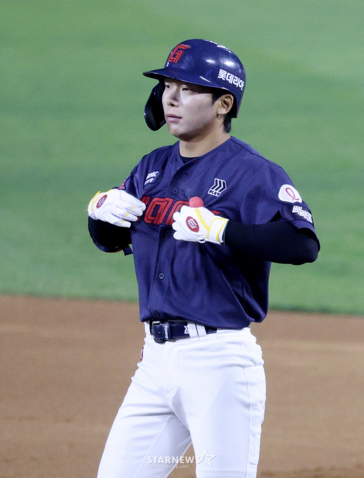2026 신한 SOL KBO리그 LG 트윈스와 롯데 자이언츠의 경기가 15일 서울 잠실야구장에서 열렸다. 롯데 장두성은 8회초 2사 1,2루 상황에서 1타점 적시타를 날렸다. 장두성은 출루 후 세리머니를 했다.