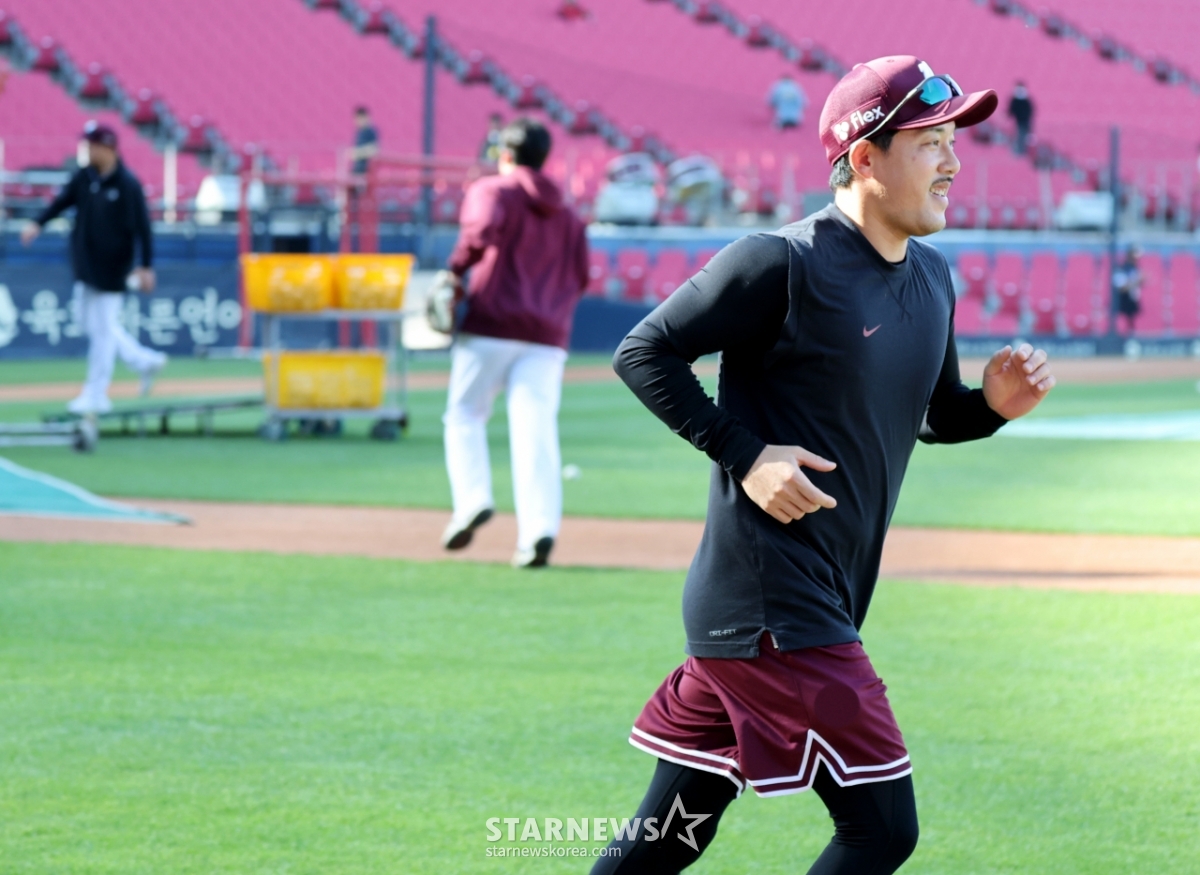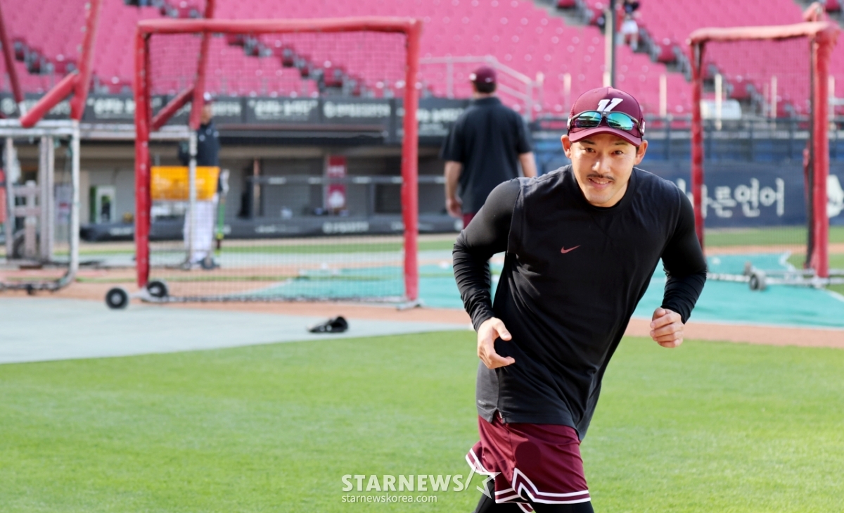 키움 플레잉코치 이용규가 16일 광주KIA챔피언스필드에서 열리는 2026KBO리그 기아타이거즈와 키움히어로즈의 경기를 앞두고 외야로 달려가고 있다. 2026.04.16.