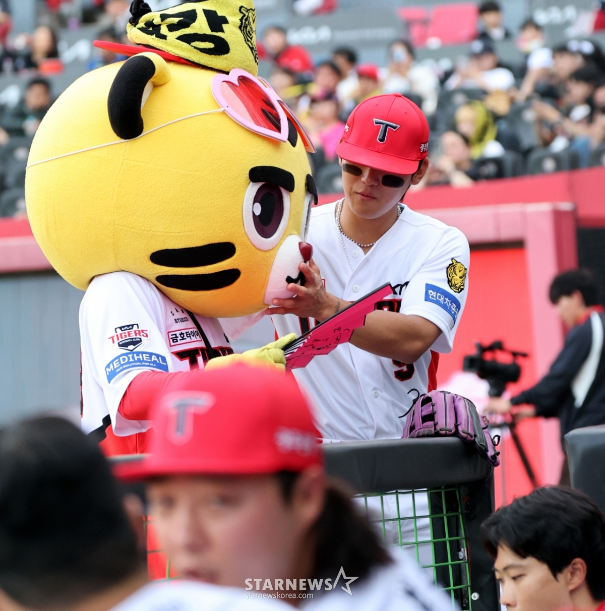 KIA 김도영이 16일 광주KIA챔피언스필드에서 열리는 2026KBO리그 기아타이거즈와 키움히어로즈의 경기 시작을 기다리던 중 마스코트 호걸이와 장난을 치고 있다.2026.04.16.