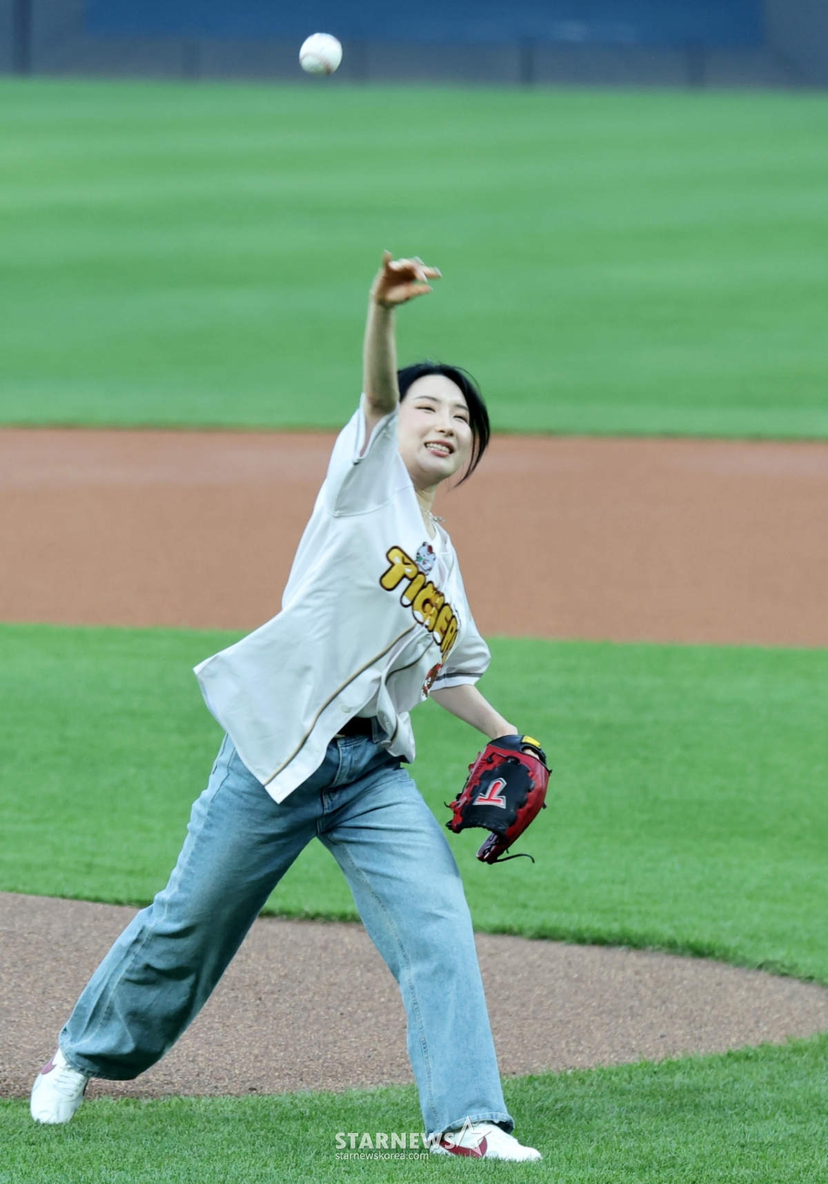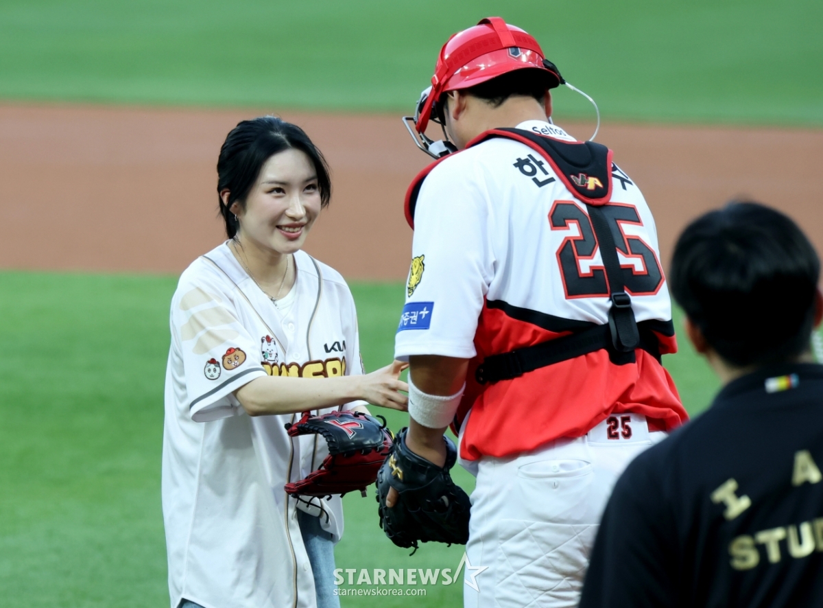동계올림픽 쇼트트랙 금메달리스트 람보르길리 김길리가 16일 광주KIA챔피언스필드에서 열리는 2026KBO리그 기아타이거즈와 키움히어로즈의 경기 시작을 알리는 시구를 하고 있다.