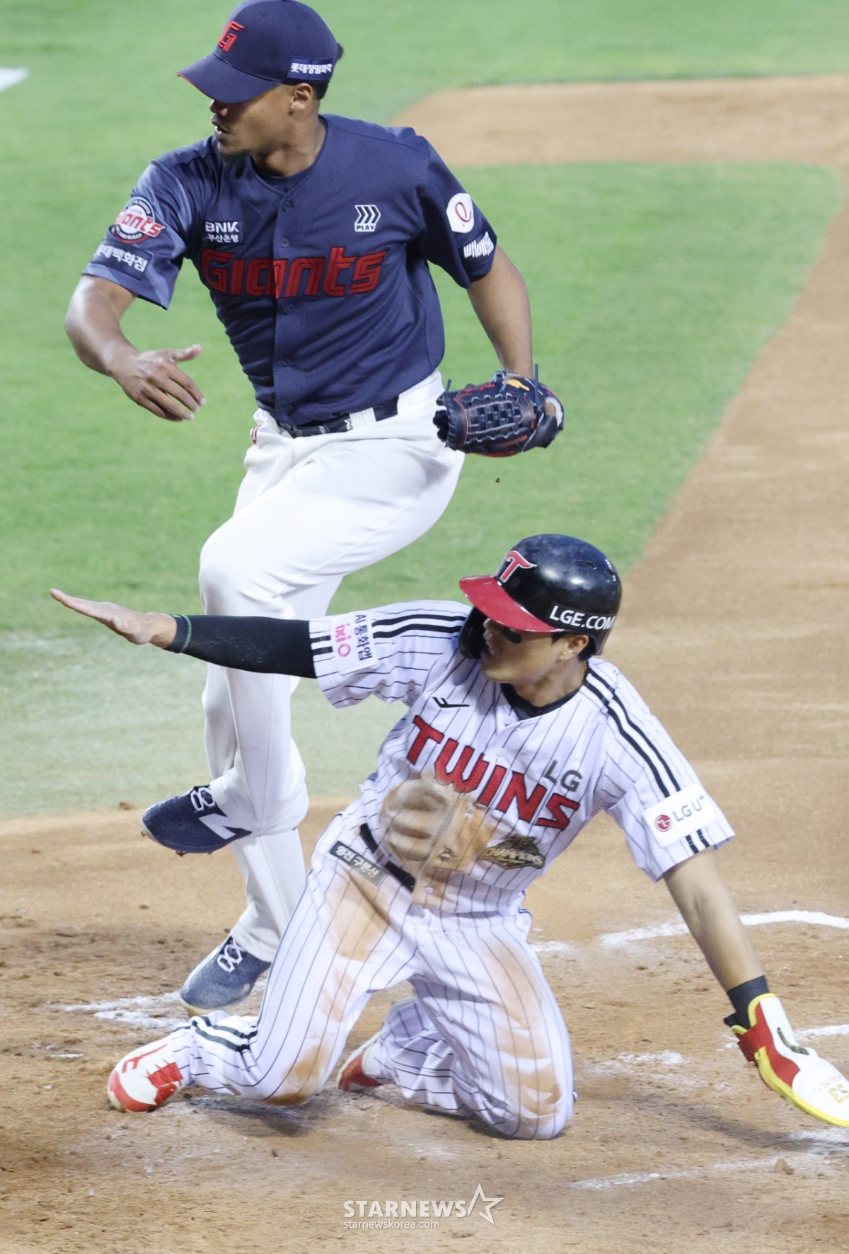 LG 2회말 1사 2루에서 2루주자 천성호가 롯데 선발 치리노스의 폭투 때 홈까지 파고들었으나 태그아웃되고 있다.