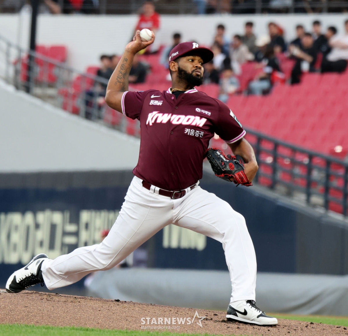 키움 우완투수 알칸타라가 16일 광주KIA챔피언스필드에서 열리는 2026KBO리그 기아타이거즈와 키움히어로즈의 경기에서 선발로 나서 역투하고 있다. 기아의 선발투수 네일과 선발대결을 펼치고 있다. 2026.04.16.