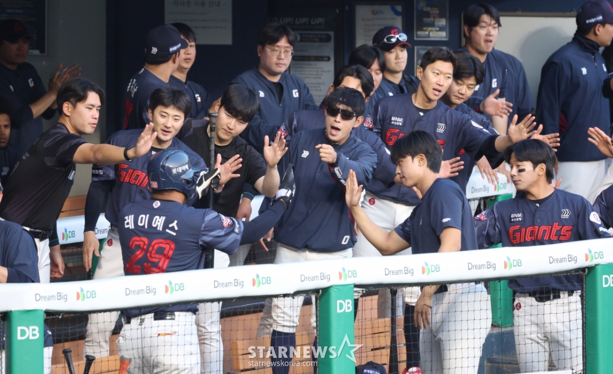 롯데 1회초 2사 1,3루에서 3루주자 레이예스가 윤동희의 적시 2루타 때 선제 득점한 후 더그아웃에서 동료들의 환영을 받고 있다.