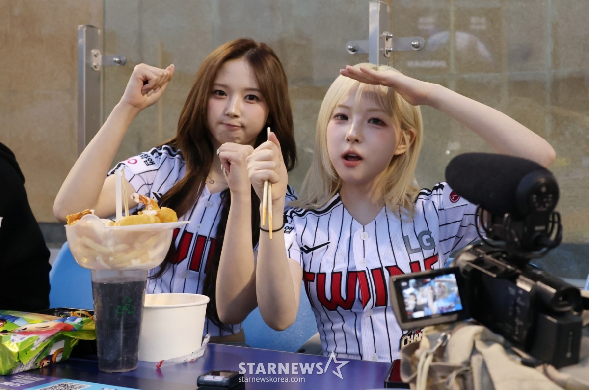 그룹 트리플에스(tripleS) 멤버 이지우와 정하연이 LG 승리기원 시구 시타를 한 후 본부석에서 허기를 달래며 응원을 하고 있다.