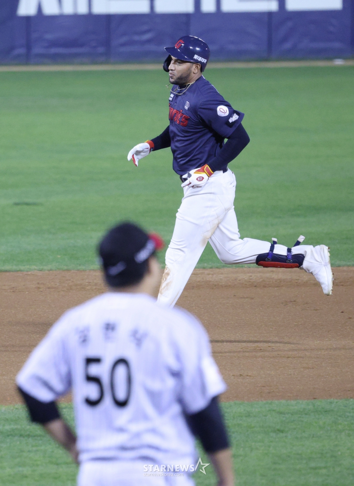 롯데 레이예스가 6회초 2사 1루에서 LG 장현식을 상대로 동점 2점 홈런을 날리고 홈인하고 있다.