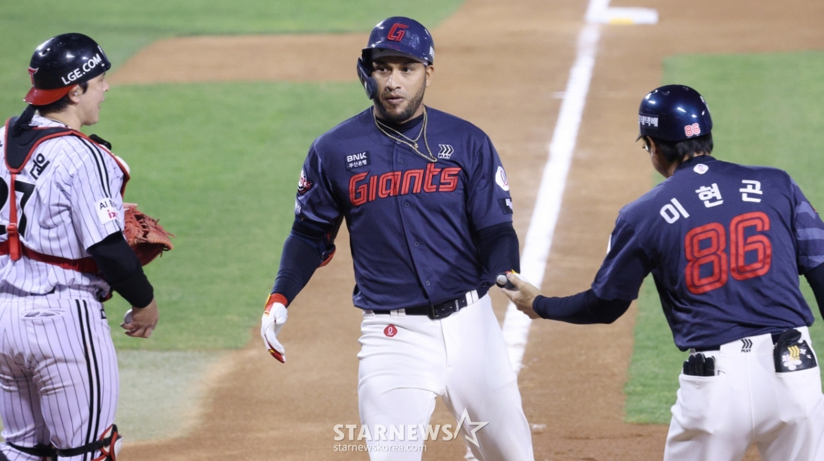 롯데 레이예스가 6회초 2사 1루에서 LG 장현식을 상대로 동점 2점 홈런을 날리고 홈인하고 있다.