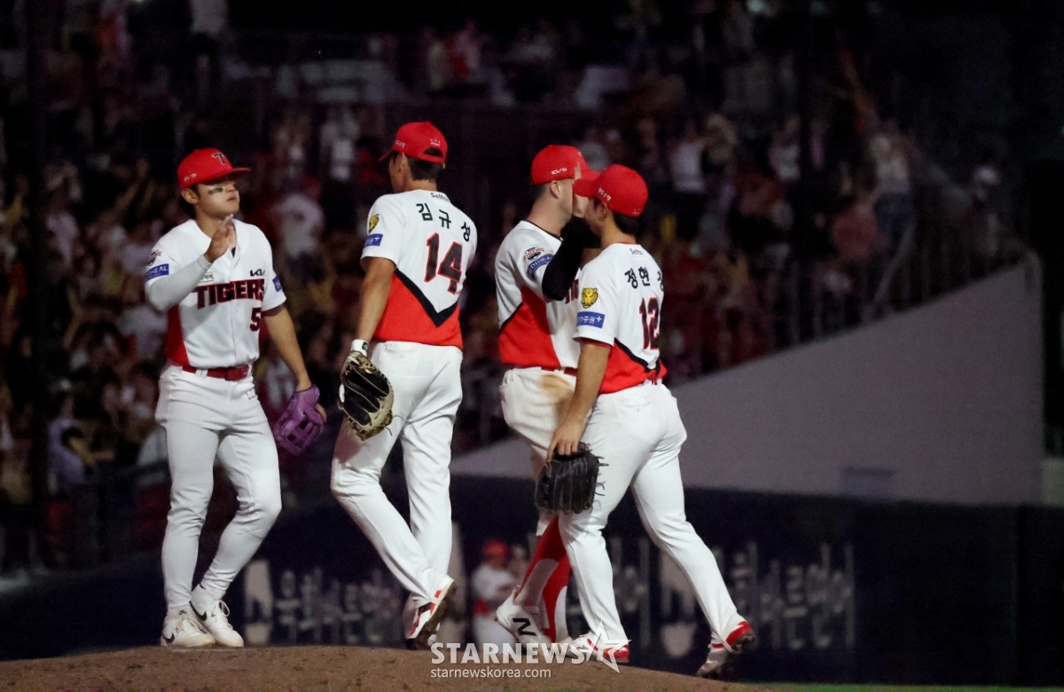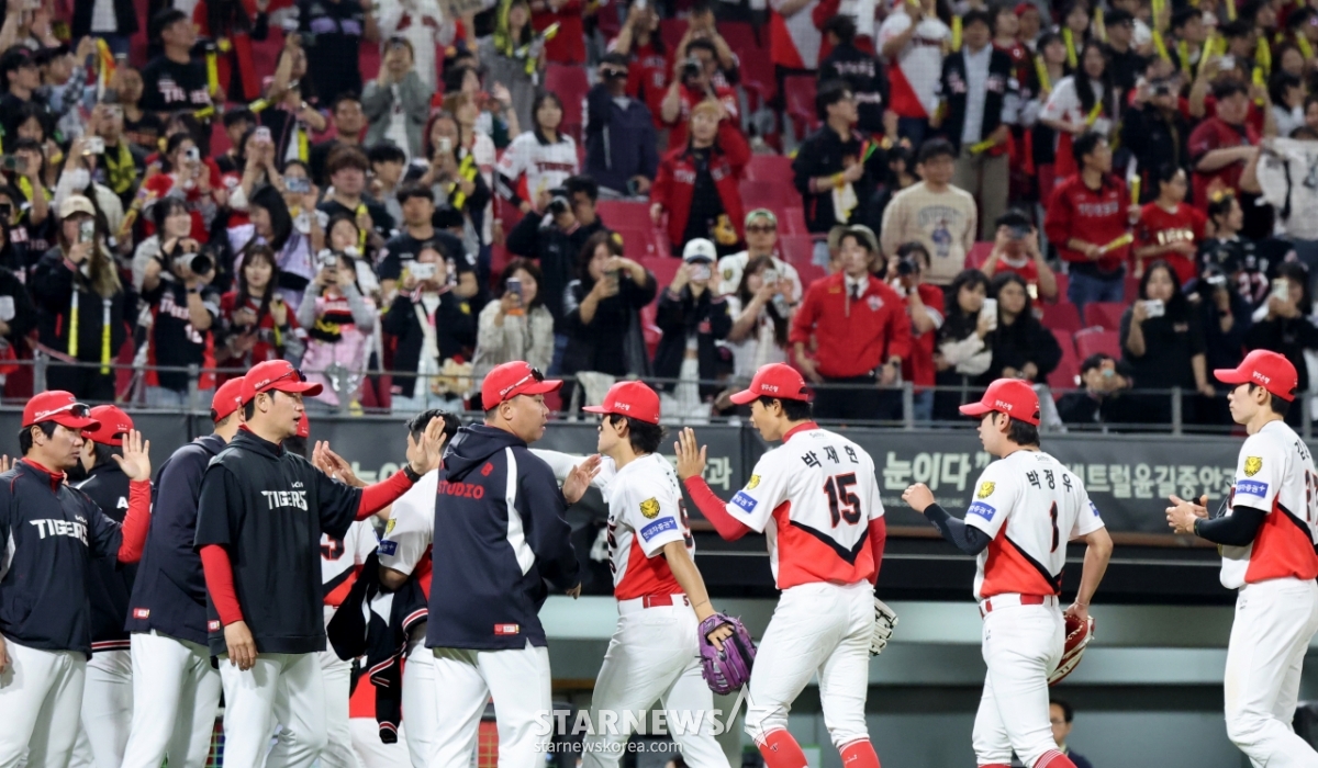 기아 선수들이 16일 광주KIA챔피언스필드에서 열린 2026KBO리그 기아타이거즈와 키움히어로즈의 경기에서 5-1로 역전승했다. 이들은 승리 후 팬들에게 인사하며 자축했다. 기아는 7연승을 질주하며 상위권으로 올라섰다.